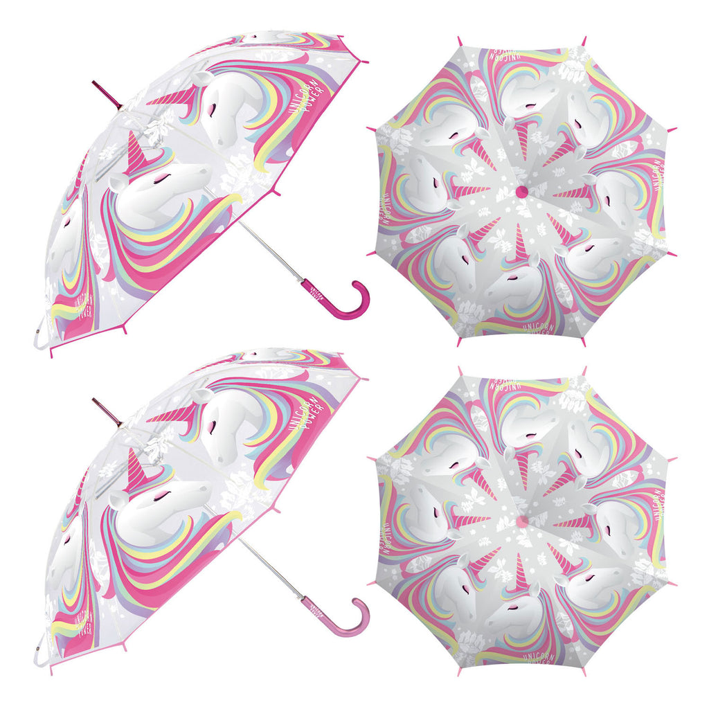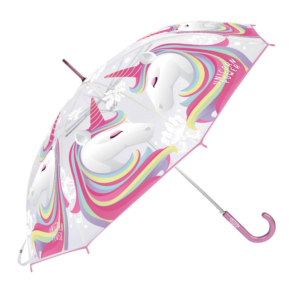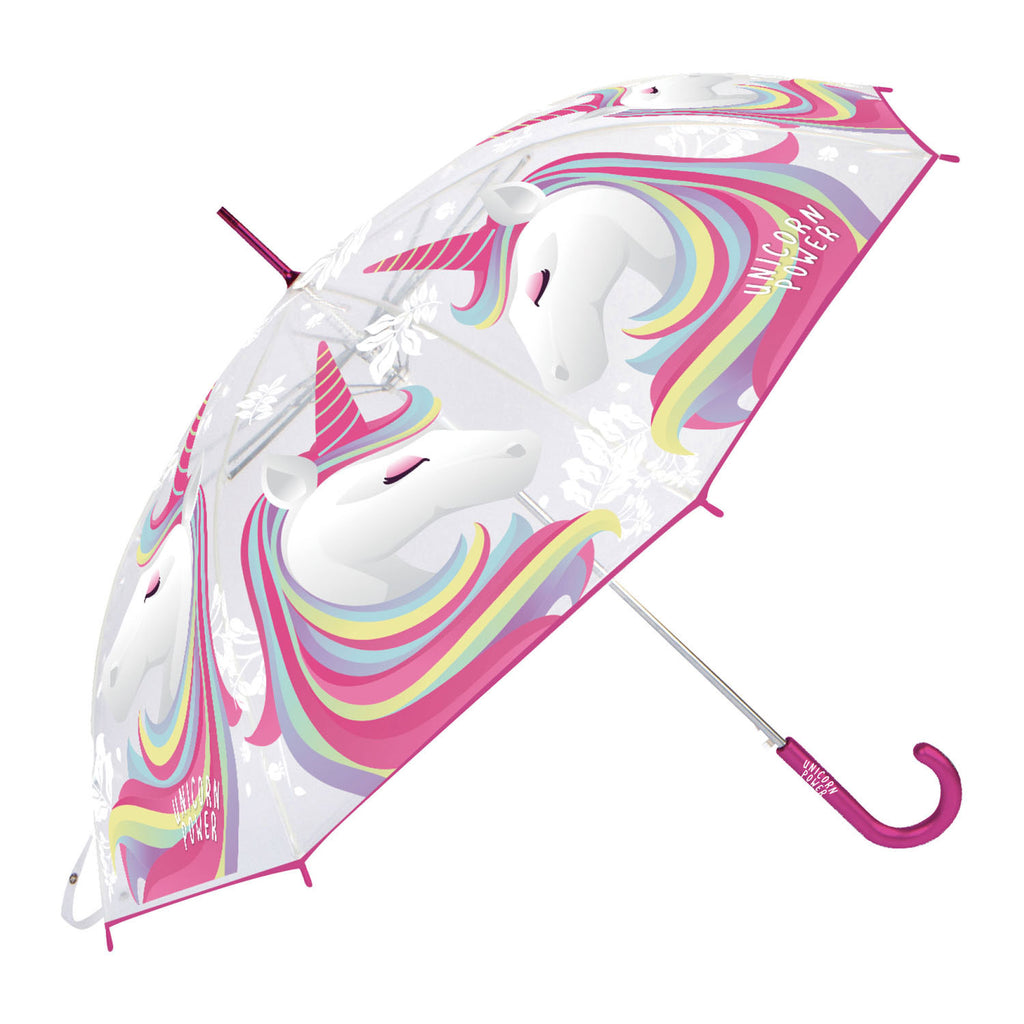 Transparante paraplu met eenhoornprint. Afmetingen: 70 cm lang, 60 cm doorsnede. Geschikt van 3 tot 6 jaar.