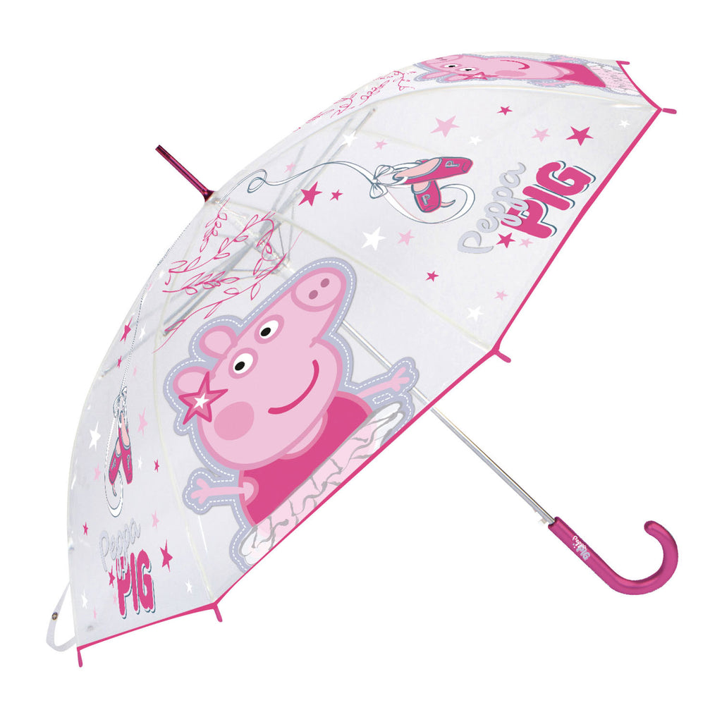 Transparante Peppa Big paraplu met roze U-vormig handvat. De paraplu is 64 centimeter lang en heeft een doorsnede van 82 centimeter. Geschikt voor kinderen van 3 tot 6 jaar oud.