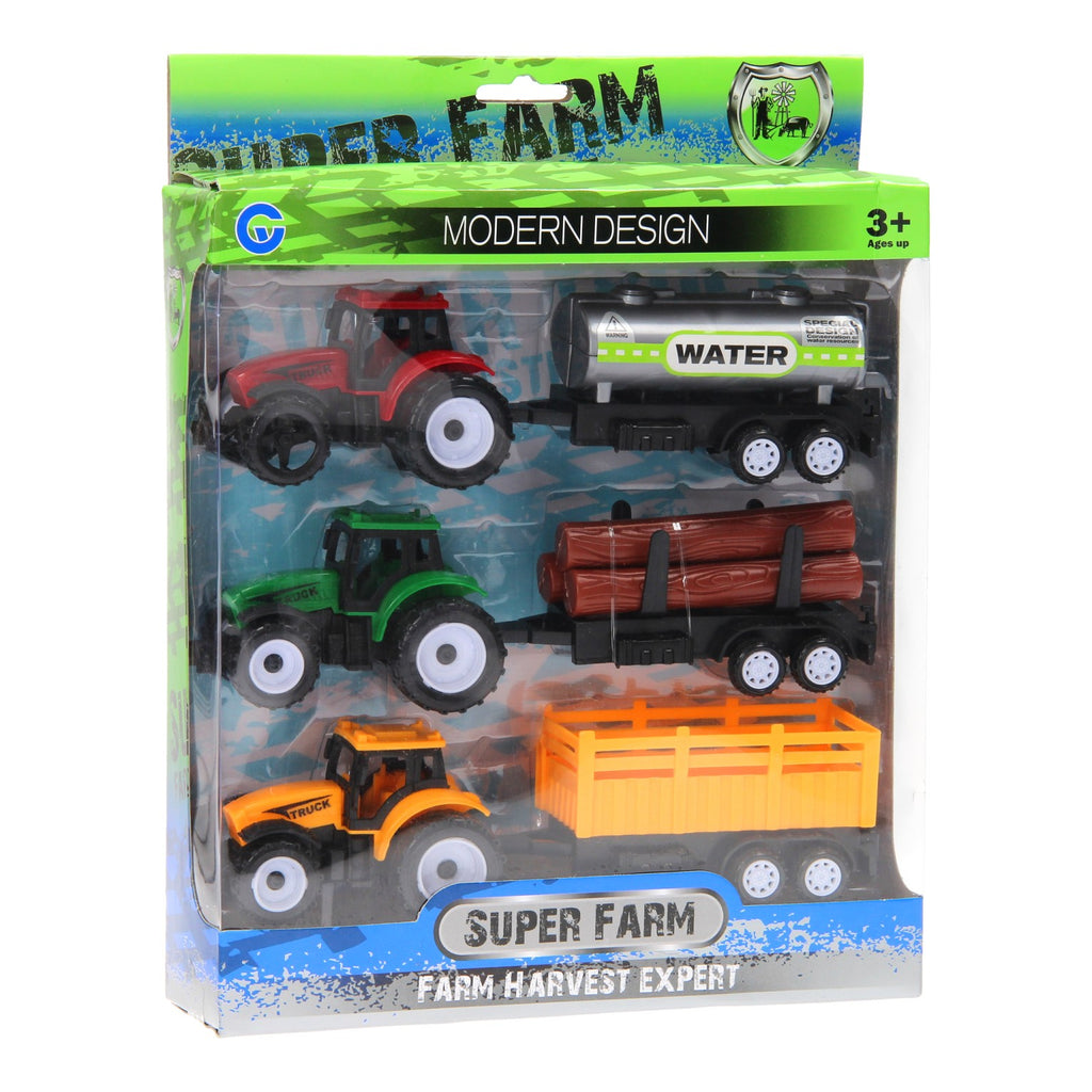 Beleef de leukste avonturen op de boerderij met deze 3-delige trekkerset. Verzamel met de groene trekker de boomstammen van het land, geef de gewassen water met de rode trekker met giertank of verzamel gras met behulp gele trekker met aanhanger. De trekkers met aanhangers zijn gemaakt van stevig kunststof en zijn niet van elkaar los te koppelen.