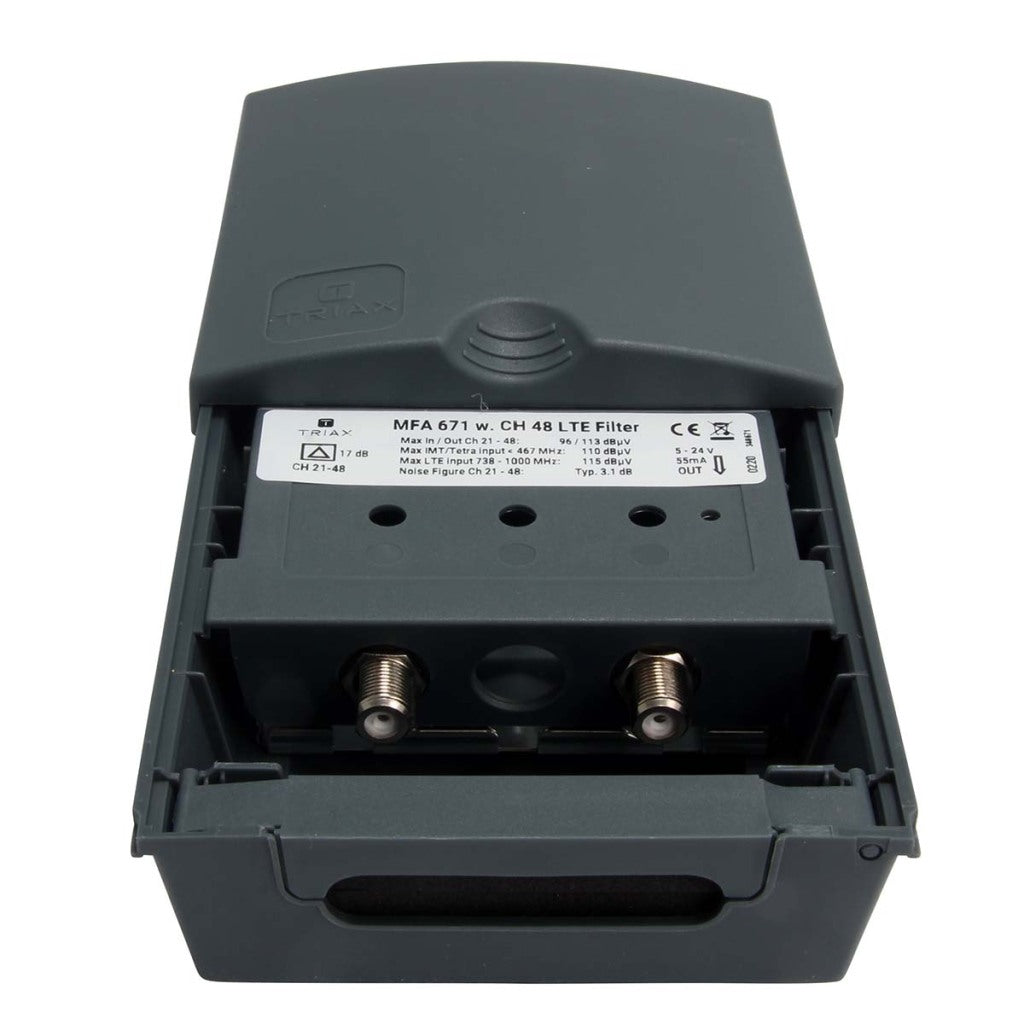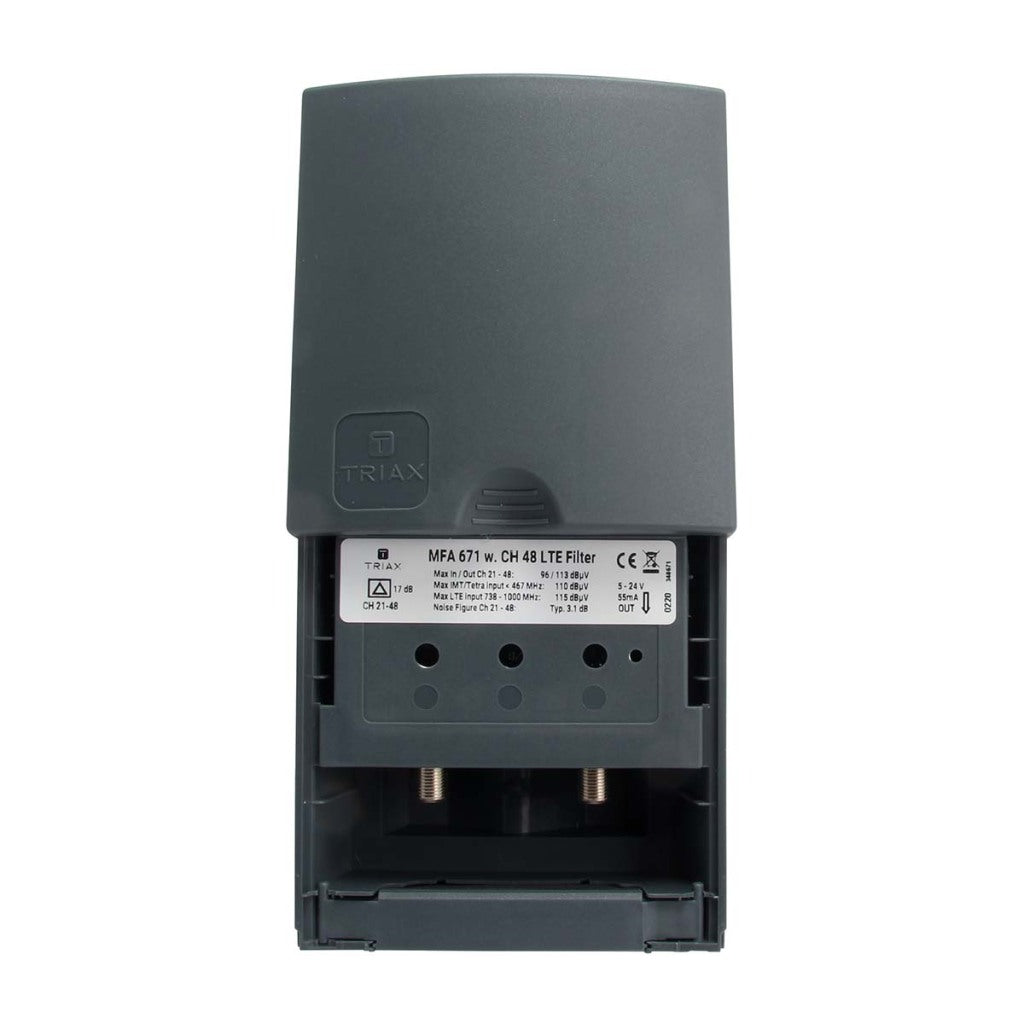 De TRIAX MFA 671 is een enkele ingang UHF (Ch. 21?48) geluidsarme, sterk RF-afgeschermde mastversterker in een moderne antraciet kunststof behuizing voor montage aan de antennemast of onder het dak.