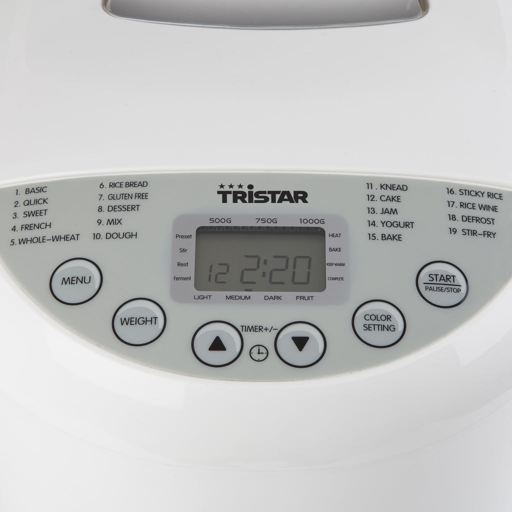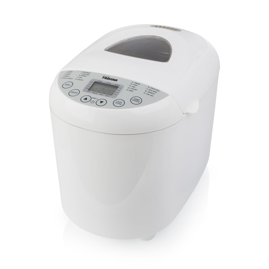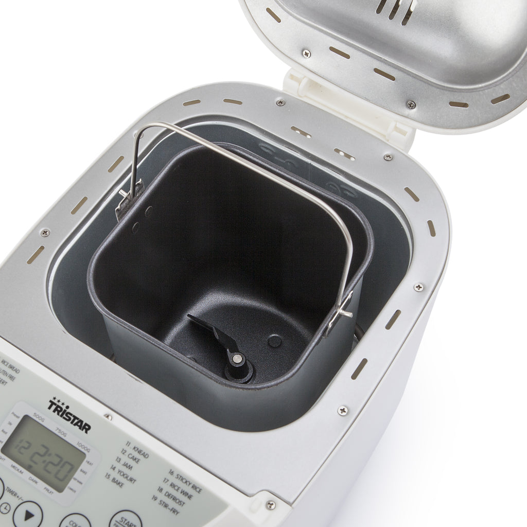 De Tristar BM4586 Broodbakmachine neemt je al het werk uit handen. Dankzij 19 verschillende bakprogramma's maak je niet alleen het lekkerste verse brood maar kun je bijvoorbeeld ook jam, yoghurt, rijst of deeg bereiden. Daarnaast is er een snel programma en een speciaal programma voor glutenvrij brood. Bij het bakken van brood kun je zelf kiezen of je wil dat de korst van het brood licht, medium of donker wordt. Doordat de broodbakmachine is voorzien van een kneedhaak, hoef je alleen de ingrediënten toe te voegen waarna de machine het werk doet.Extra luxe functies