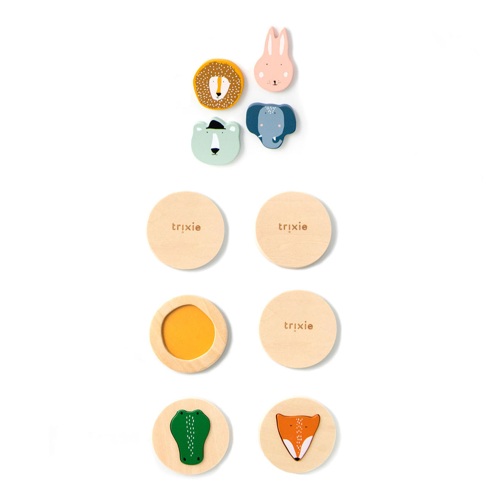 Dit spel kan je op veel leuke manieren spelen! Het is een leuke eerste puzzel, waarbij je probeert de dierenkop in de juiste cirkel te passen. Maar de pret begint pas echt als je samen speelt en probeert om zoveel mogelijk dieren met de juiste cirkel te matchen. Elke speler trekt een aantal dierenhoofden. De schijfjes worden met de bovenkant naar beneden op tafel gelegd. Elke beurt kan een speler een cirkel ronddraaien en controleren of deze overeenkomt met een van zijn of haar dieren. De eerste die alle dieren verzameld heeft, wint! Dit spel oefent zowel motorische als cognitieve vaardigheden. In het begin zullen kinderen het leuk vinden om over kleuren en dieren te leren. Eens wat ouder zullen ze de spanning van het spel ontdekken terwijl ze spelenderwijs hun geheugen trainen. Alle elementen zijn gemaakt van 100% FSC © gecertificeerd hout. Alle verven zijn op waterbasis en veilig voor baby's.