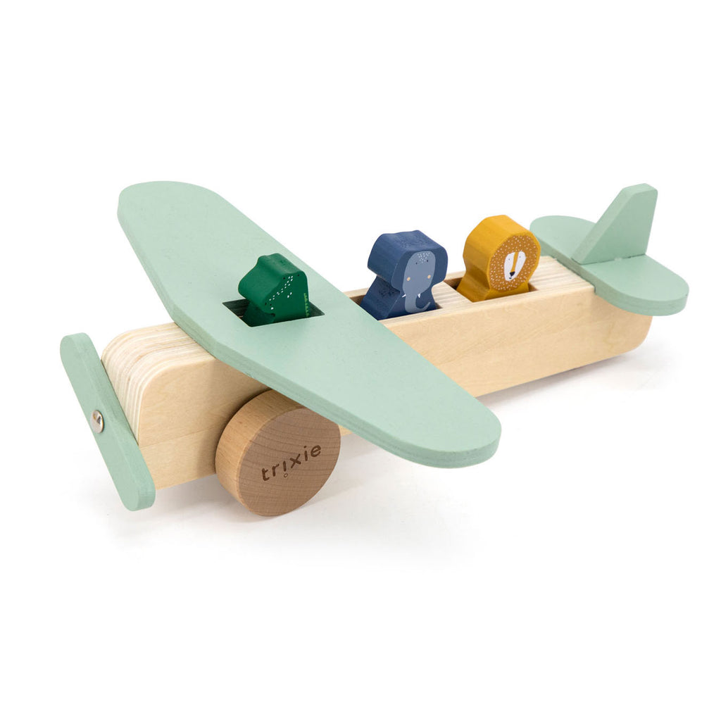Kom mee vliegen met onze dierenvrienden! Mr. Crocodile is klaar om op te stijgen. Samen met zijn twee passagiers reizen ze de wereld rond. Elke dierenpion past in elke stoel. Een wiel aan de voorkant en een verborgen wiel aan de achterkant zorgen ervoor dat de dieren veilig kunnen landen. Draai aan de propellor en het vliegtuig is klaar om te vertrekken! Het vliegtuig en de dieren zijn gemaakt van 100% FSC © gecertificeerd hout. Alle verven zijn op waterbasis en veilig voor baby's.