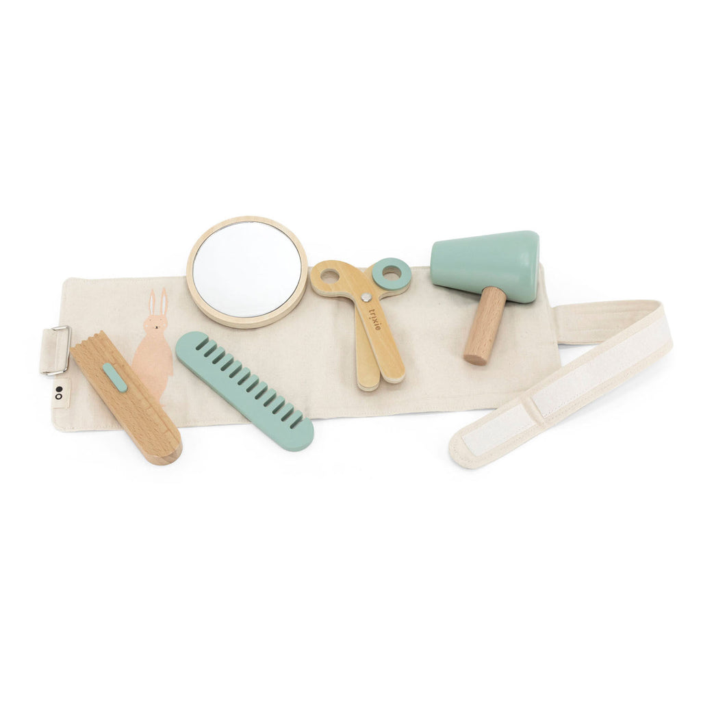 Een prachtige kappersset die garant staat voor urenlang speelplezier! Kam, knip, scheer of föhn je haar en bekijk het resultaat in het spiegeltje. Het zakje kan om de heupen worden gedragen. Perfect om je favoriete pop of broers en zussen een grote make-over te geven!