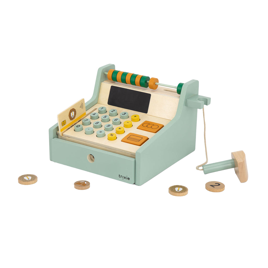 Deze leuke kassa heeft het allemaal! Begin met het scannen van alle artikelen in uw winkelwagen met de handige scanner aan de zijkant van de kassa. Zodra je het totale bedrag hebt, steek je je munten in de gleuf en hoor je de bel rinkelen telkens wanneer je een munt laat vallen. Met het telraam bovenaan het register kunt u het betaalde bedrag bijhouden. Geen contant geld meer? De kassa wordt naast munten ook geleverd met een bankpas en beschikt over een terminal om met de bankpas te betalen. De kassa is voorzien van leuke drukknoppen en de lade schuift gemakkelijk open om alle muntjes op te vangen. Het perfecte speelgoed voor urenlang fantasiespel, terwijl het ook de wiskundige interesse en fijne motoriek stimuleert.