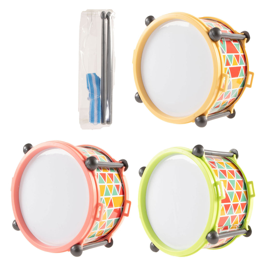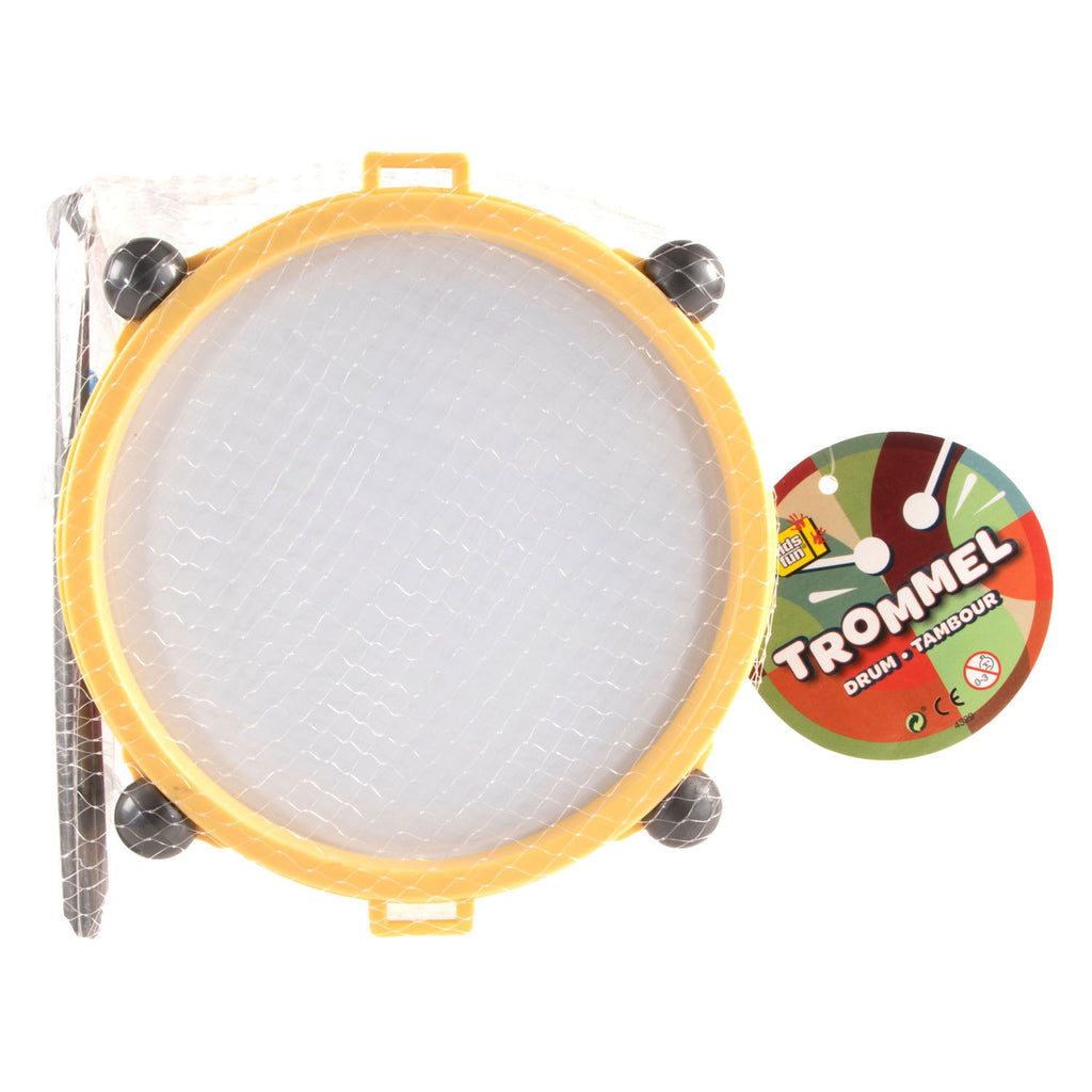 Trommel met koord en drumsticks. Afmeting: 22 centimeter diameter.