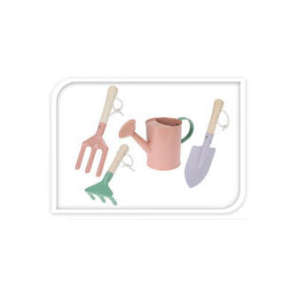Set tuingereedschap voor kinderen in blauwe opbergtas met witte stippen. Inhoud: 1 tas, 1 gieter, 1 schep, 1 hark en 1 schoffel. Geschikt vanaf 3 jaar. Gereedschap is gemaakt van hout en metaal.