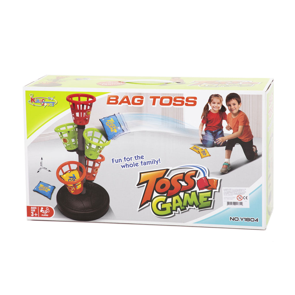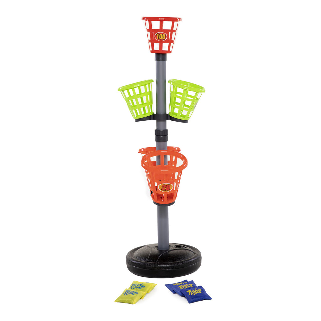 Gooi zoveel mogelijk zakjes raak met de Toss Game - Zakjes Werpen! De buitenspeelset bestaat uit een standaard met 5 mandjes, 3 gele zakjes en 3 blauwe zakjes. Gooi je een zakje in een van de onderste oranje mandjes dan ontvang je 20 punten, raak gooien in de middelste groene mandjes geeft je 50 punten en scoren in het bovenste rode mandje levert 100 punten! Wie wint de Toss Game - Zakjes Werpen, degene met de gele of blauwe zakjes?