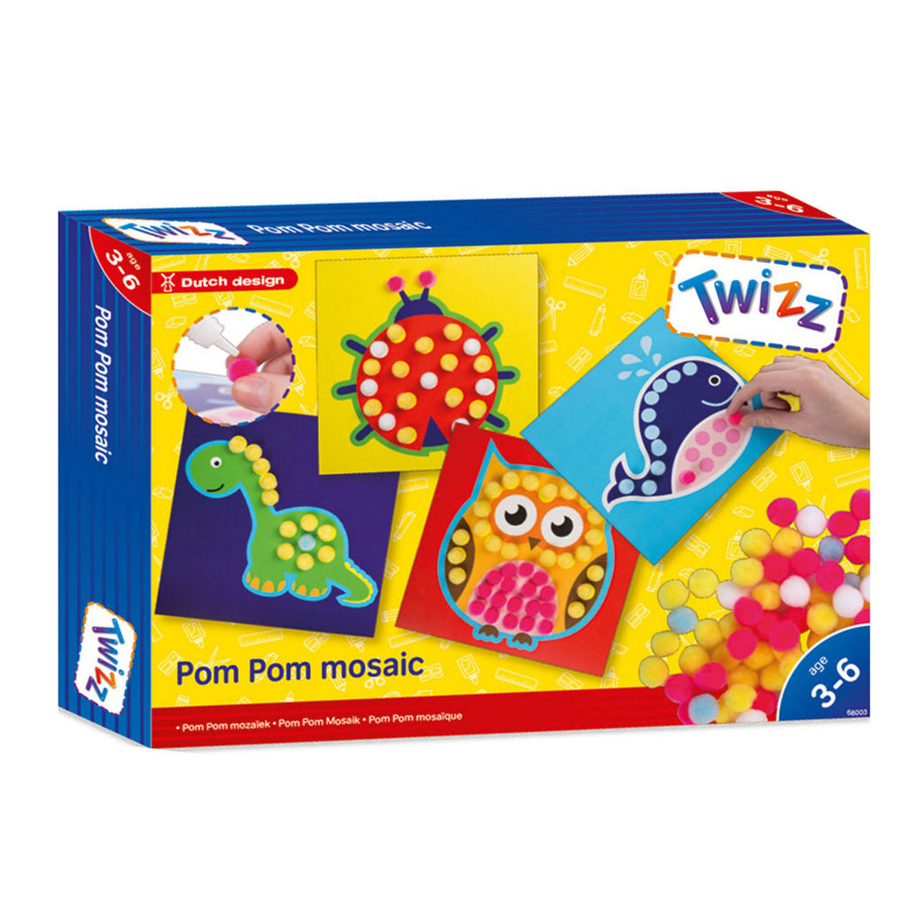 De Twizz Pom Pom Mozaïek set bevat 4 afbeeldingen, lijm en 125 pom-poms in 4 kleuren. Welke vrolijke kleurtjes krijgen jouw dolfijn, dinosaurus, lievenheersbeest en uil? Geschikt voor kinderen vanaf 3 jaar.