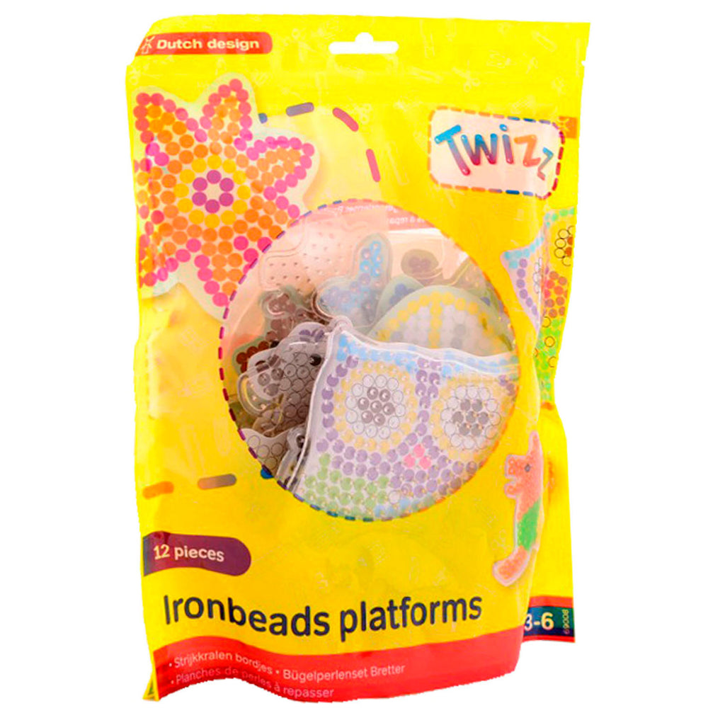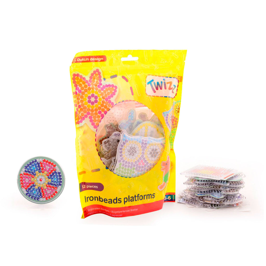 12 Twizz Strijkkralenbordjes in de vorm van verschillende figuren, waaronder een vierkant, rondje en uiltje. Om je urenlang mee te vermaken! Exclusief strijkkralen.