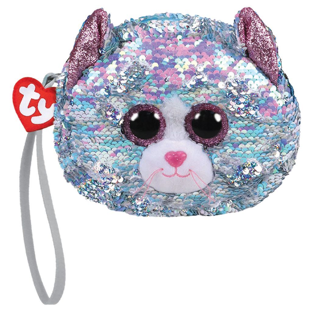 Whimsy, de kat, heeft pailletten, draai ze om voor een zilverachtig gezicht.Met haar glinsterende oren en kleine, roze neus past deze schattige portemonnee bij al je kleding.