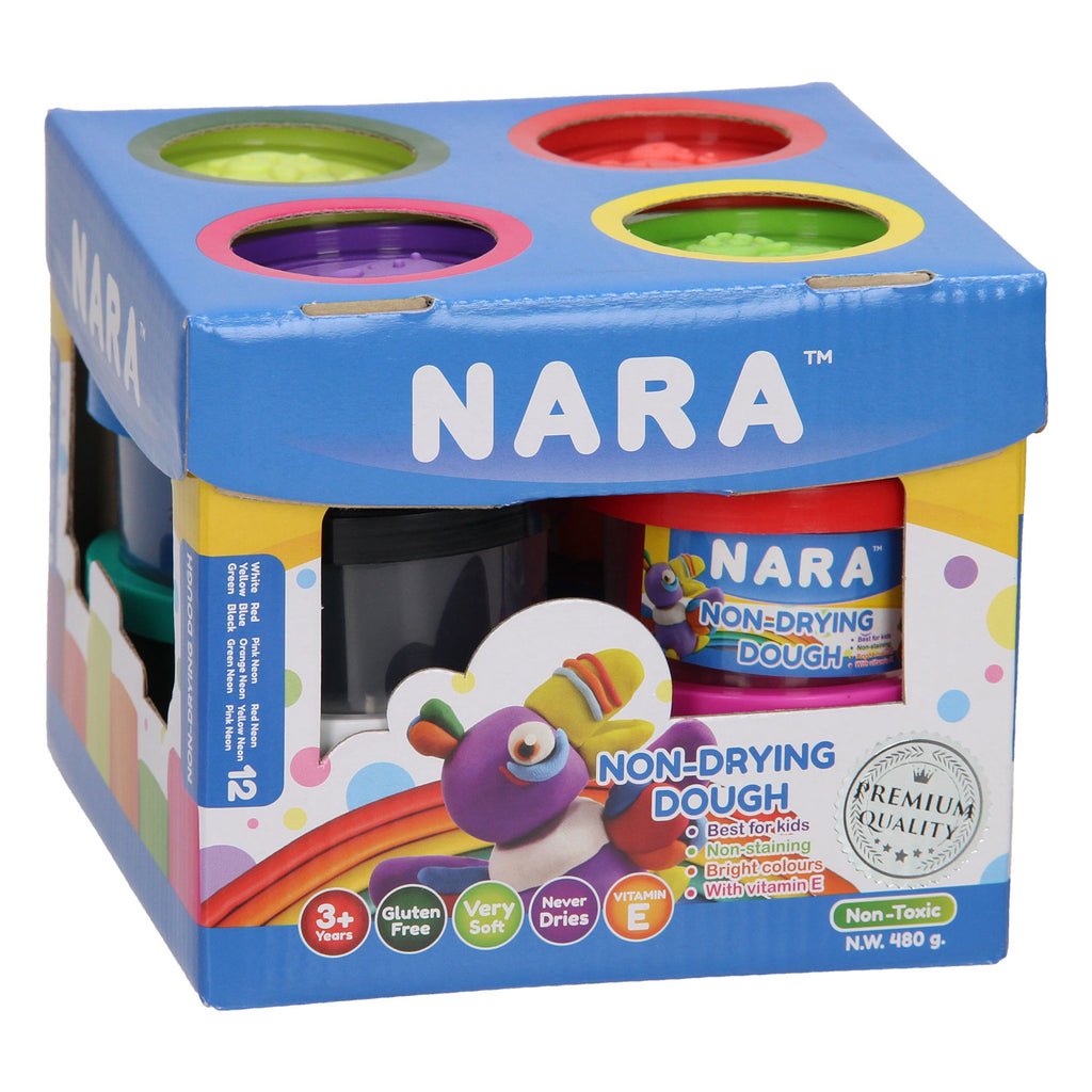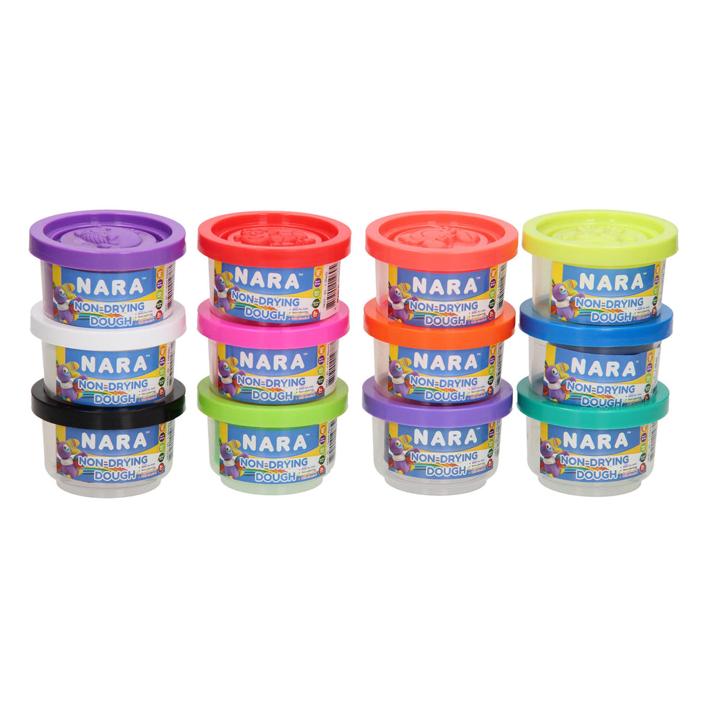 12 potjes verschillende kleuren klei. Geschikt vanaf 3 jaar.