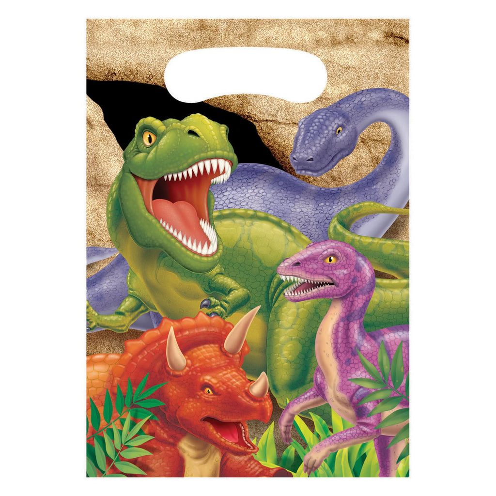 Plastic uitdeelzakjes in het thema 'dino blast'. Deze verpakking bevat 8 losse uitdeelzakjes met opdruk van dinosaurussen. Leuk voor een dino kinderfeestje!