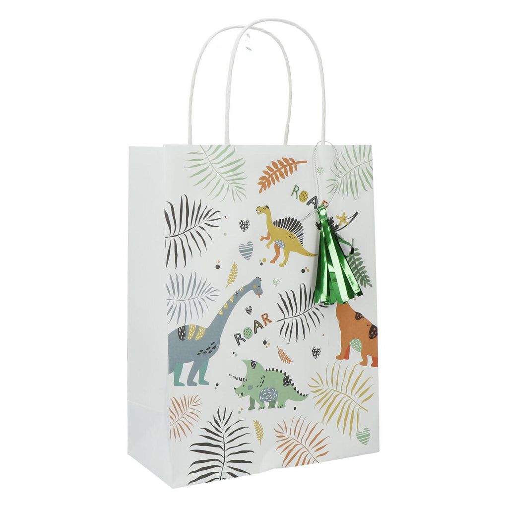 Zes stoere dinosaurus uitdeelzakjes voor cadeautjes of lekkernijen. Ga je trakteren en ben je fan van dino’s? Deze leuke cadeautasjes zijn perfect voor jouw feestje! De uitdeelzakjes zijn ongeveer 27 x 20 centimeter groot en zijn dubbelzijdig bedrukt. Aan elk tasje zit een tassel. De verpakking bevat 6 stuks. Gemaakt van papier.