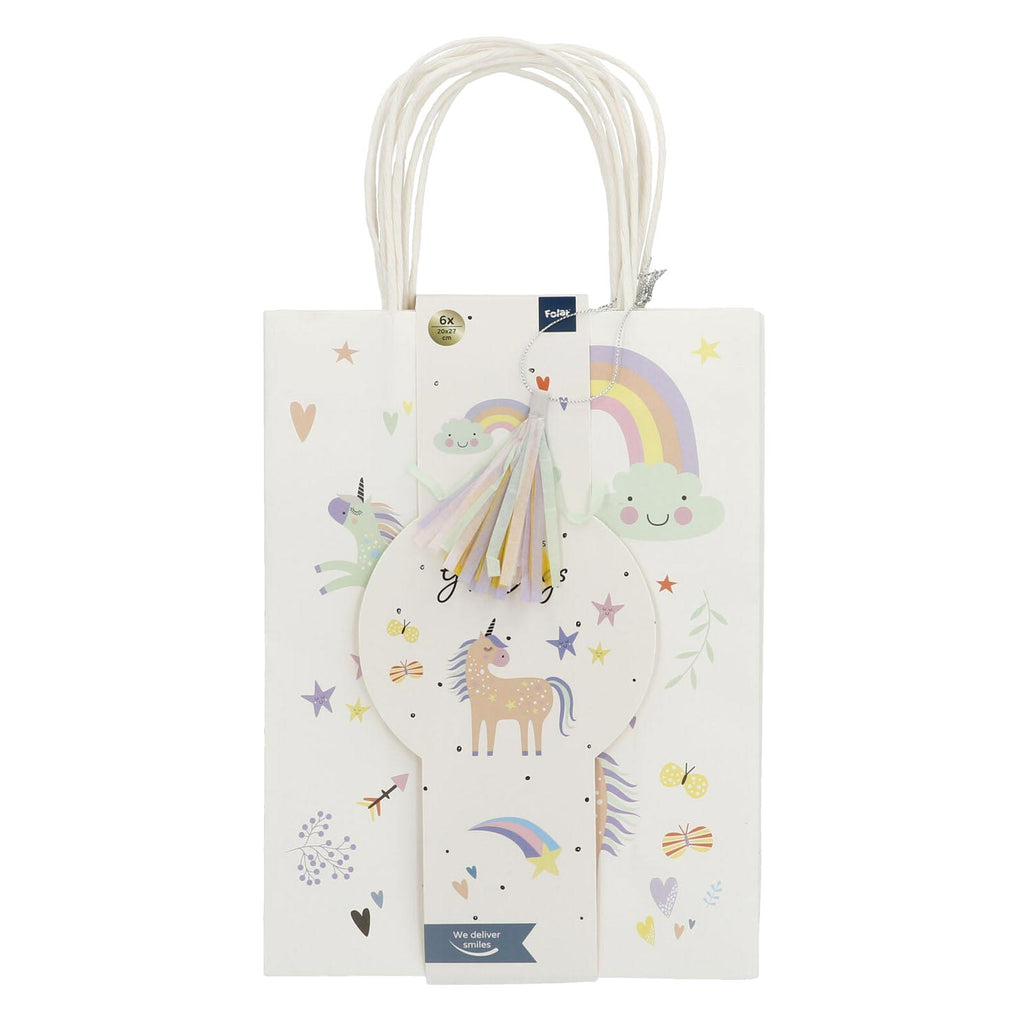 Zes mooie unicorn uitdeelzakjes voor cadeautjes of lekkernijen. Ga je trakteren en ben je fan van eenhoorns? De uitdeelzakjes zijn ongeveer 27 x 20 centimeter groot en zijn dubbelzijdig bedrukt. Aan elk tasje zit een tassel. De verpakking bevat 6 stuks. Gemaakt van papier.