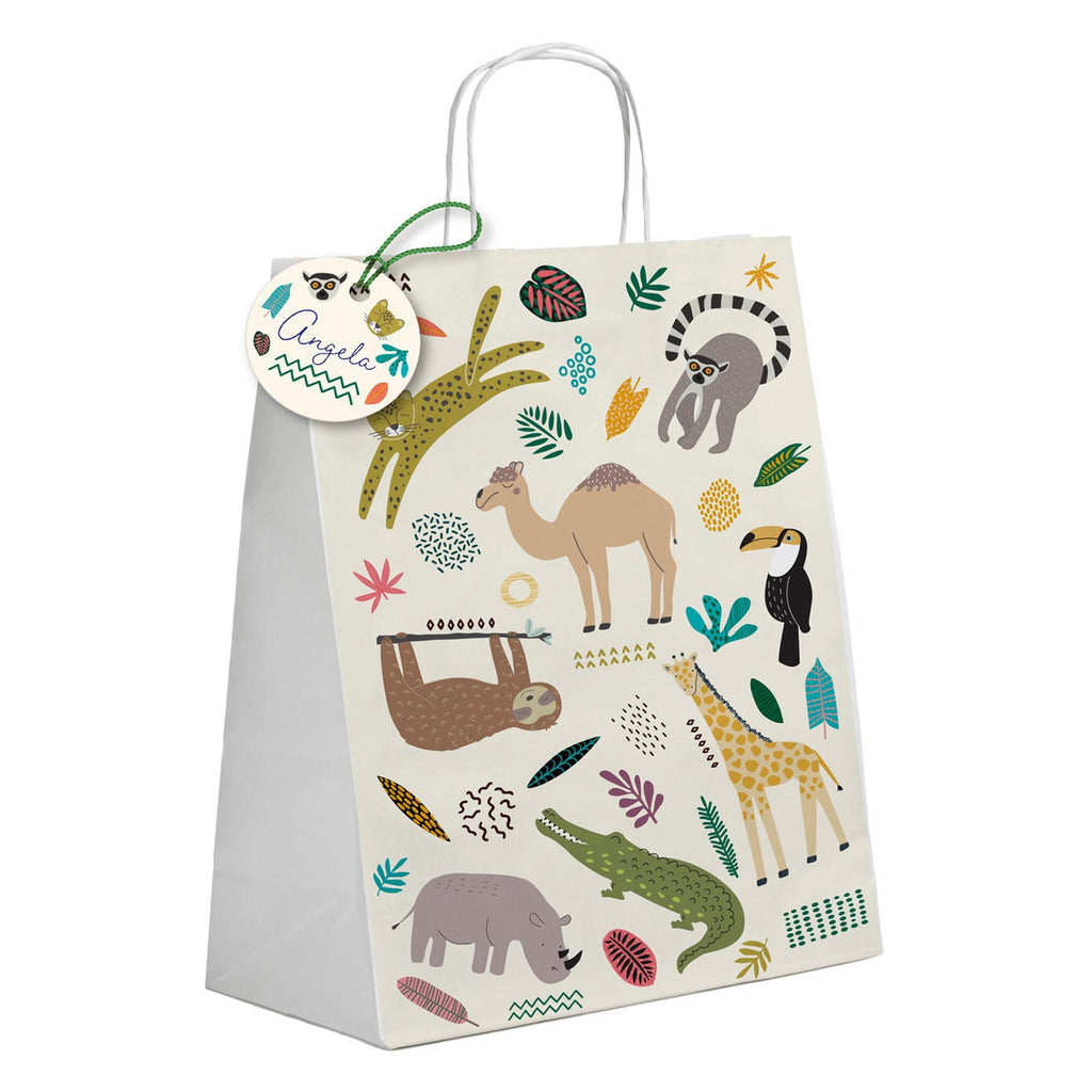 Uitdeelzakjes in wilde dieren thema van ongeveer 27 x 20 centimeter groot, dubbelzijdig bedrukt. Aan elk tasje zit een naamkaartje. De verpakking bevat 6 stuks. Gemaakt van papier.