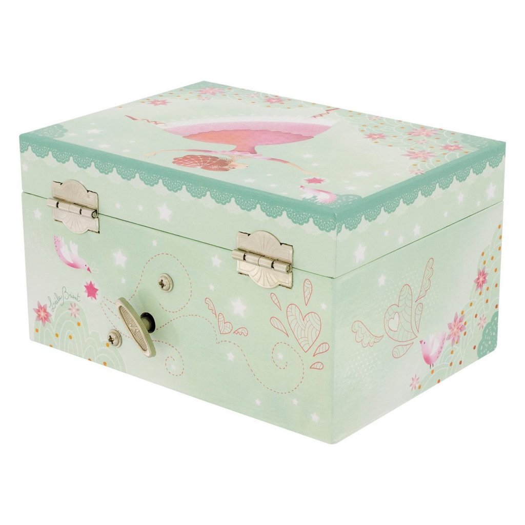 Ulyssegroen sieradendoosje met muziek en met een afbeelding van een meisje met een vogel. Als je het doosje opent dan hoor je een muziekje en zie je de ballerina dansen. Afmeting ca. 15 x 10 x 8 cm.