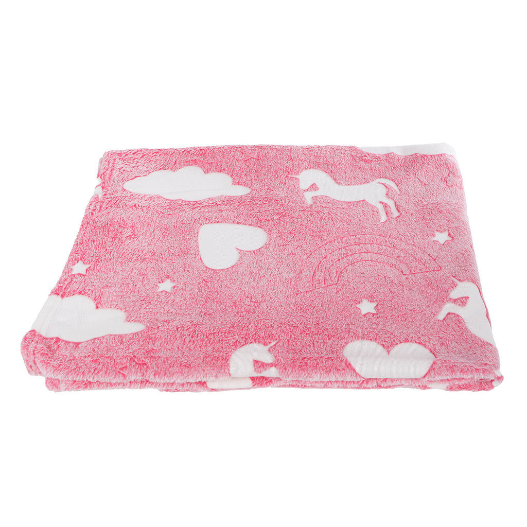 Zachte, roze deken met eenhoornprint en glow in the dark effect. Afmetingen: 100 x 150 centimeter.
