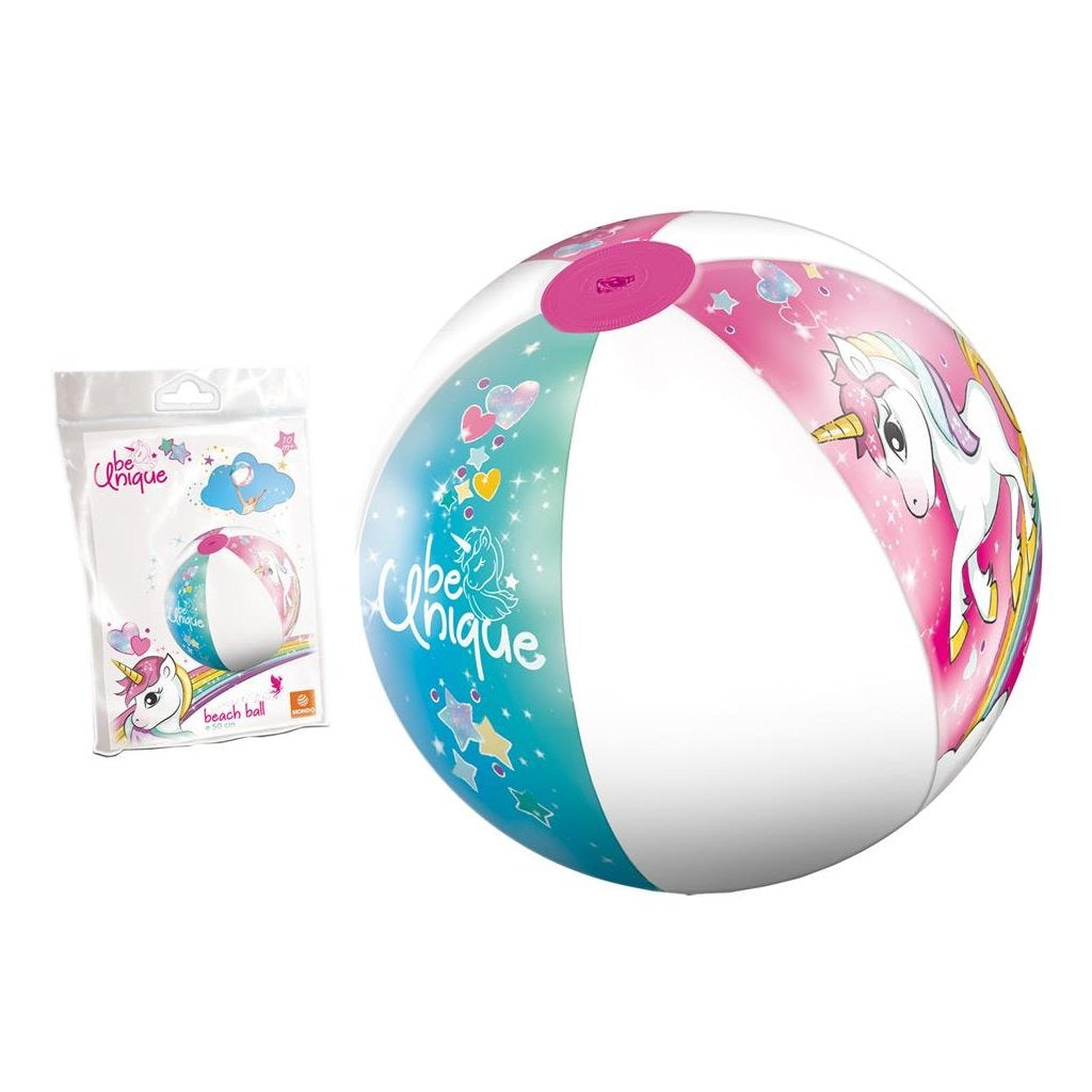 Strandbal met twee eenhoorns erop afgebeeld. Opgeblazen een diameter van 50 centimeter.