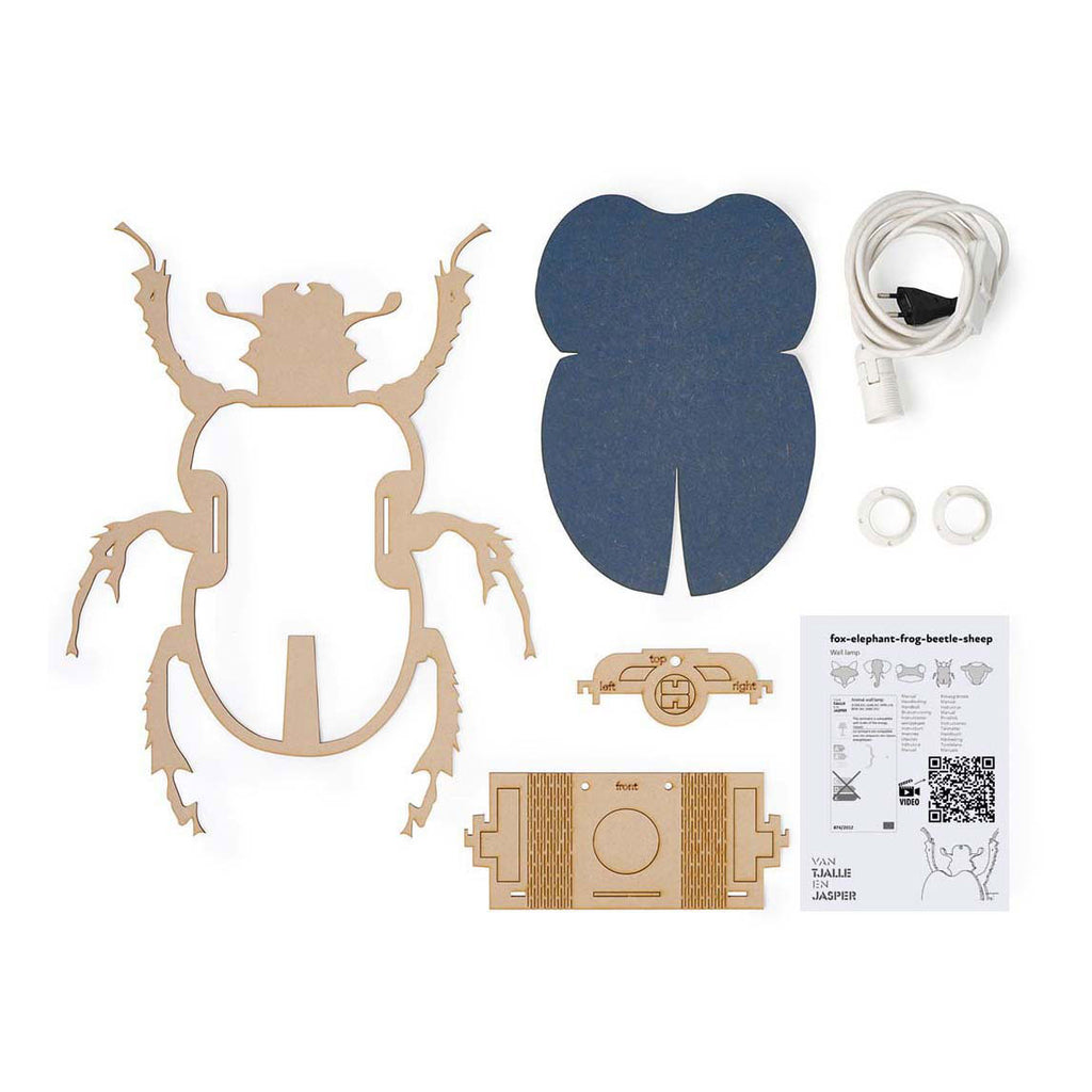De kever wandlamp wordt geleverd als een handig doe-het-zelf bouwpakket. In de doos vind je alle benodigde onderdelen en een duidelijke handleiding. De montage is eenvoudig en duurt slechts enkele minuten. **Let op: de lichtbron wordt niet meegeleverd.** Wij adviseren een energiezuinige LED-lichtbron.
