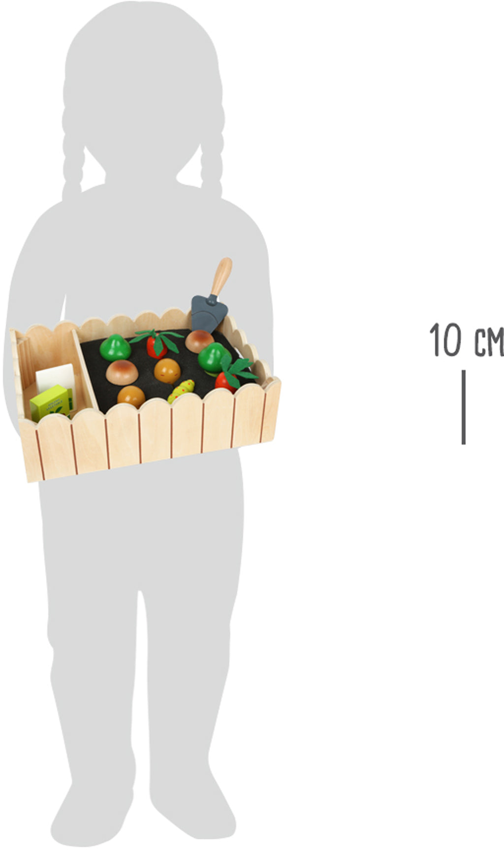 Alle jonge tuiniers opgelet! Dit moestuinbed met houten border biedt alles wat de harten van jonge tuinders sneller doet kloppen. Naast wortelen, paddenstoelen, aardappelen en brocolli heeft deze set ook een schep, kunstmest en zaden. En bovendien is er een kleine groene rups naar binnen geslopen! De jonge tuiniers leren al spelend hoe groenten worden geplant.