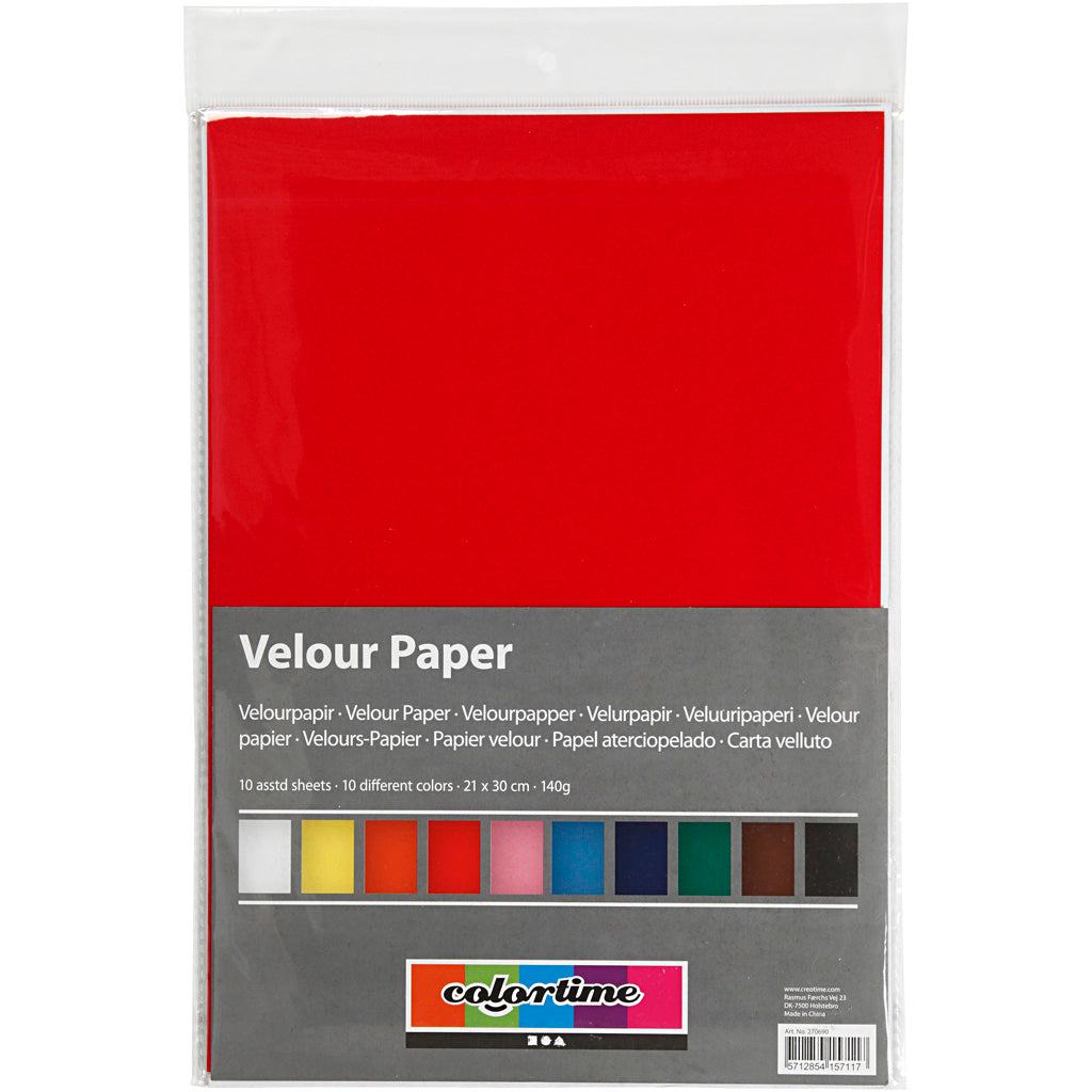 Velours 140 grams A4-papier. De vellen hebben verschillende kleuren. Inhoud: 10 vellen.