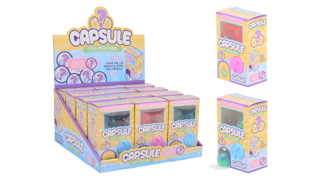 Kartonnen vendingapparaat. Draai aan de knop en laat je verrassen door één van de zes verrassingsballetjes. Afmetingen: 8,5 x 5,5 x 13,5 centimeter. Niet geschikt voor kinderen jonger dan 3 jaar.