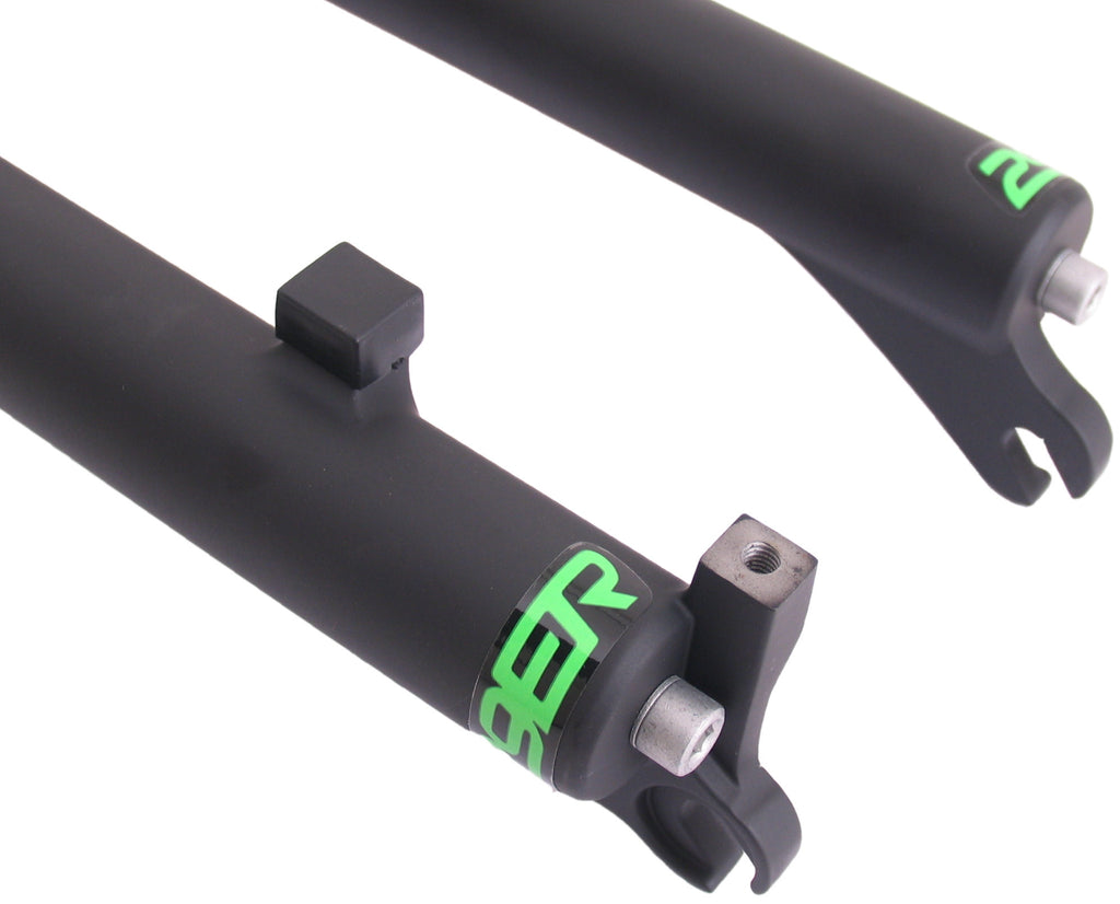 Vol aluminium voorvork van Spinner. Specificaties: Maat: 29 inch / 29er Vorkbuis: 300 mm / 1-1/8" Binnenbuis diameter: 30 mm Veerweg: 100 mm Instelbaar: ja, zonder lock-out Rembevestigingen: Post Mount schijfrembevestigingsmogelijkheid Kleur: mat zwart