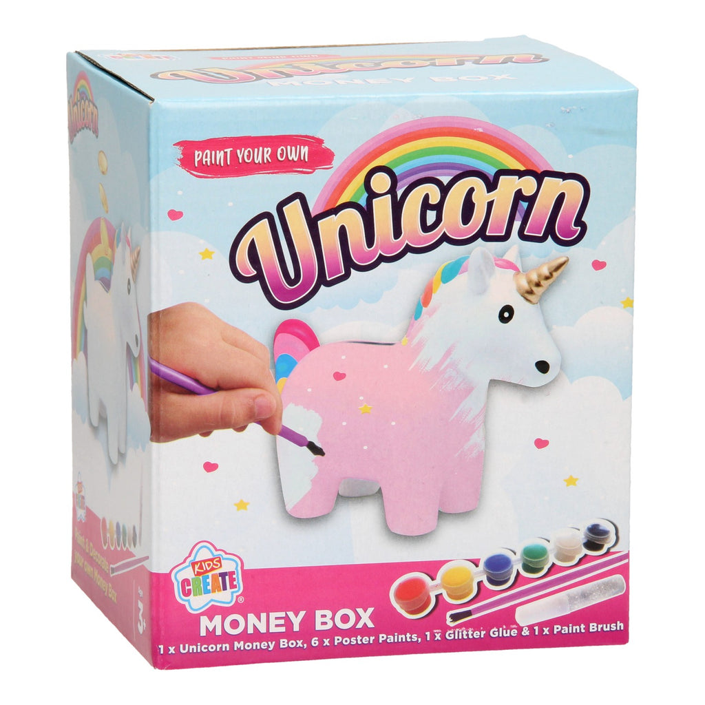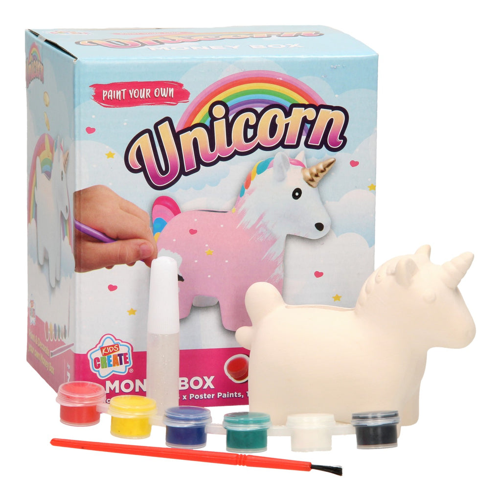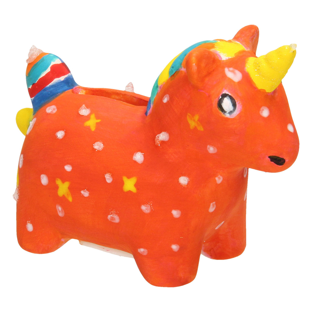 Ben jij gek op unicorns en heb je nog een goede plek nodig voor je zakgeld? Met dit schildersetje ga je aan de slag met een spaarpot in de vorm van je favoriete fantasie dier. In het setje zitten zes kleine potjes verf, glitterlijm en een verfkwast. Laat de verf drogen en de spaarpot is klaar voor gebruik!