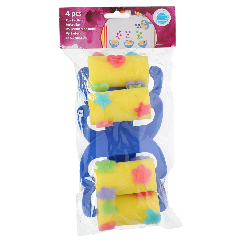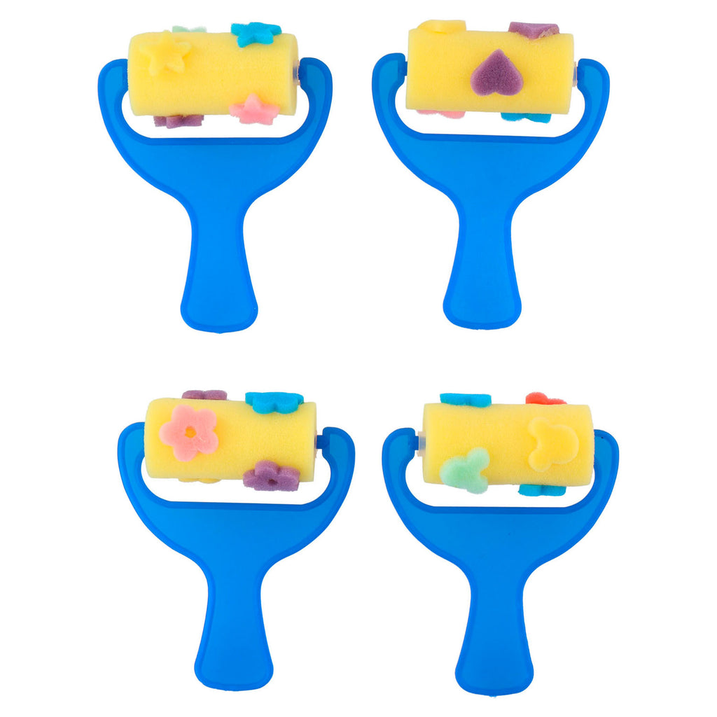 Maak prachtige kunstwerken met deze verfrollers. De rollers hebben een blauw handvat en iedere roller heeft een ander patroon. Het patroon bestaat uit een hart, een ster, een bloem en een beertje. Pak een groot vel wit papier, rol de roller in de verf en het knutselen kan beginnen!