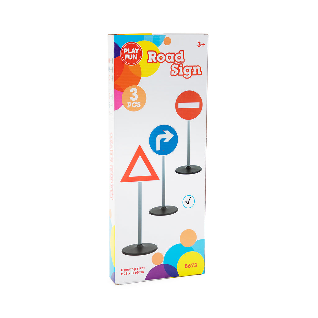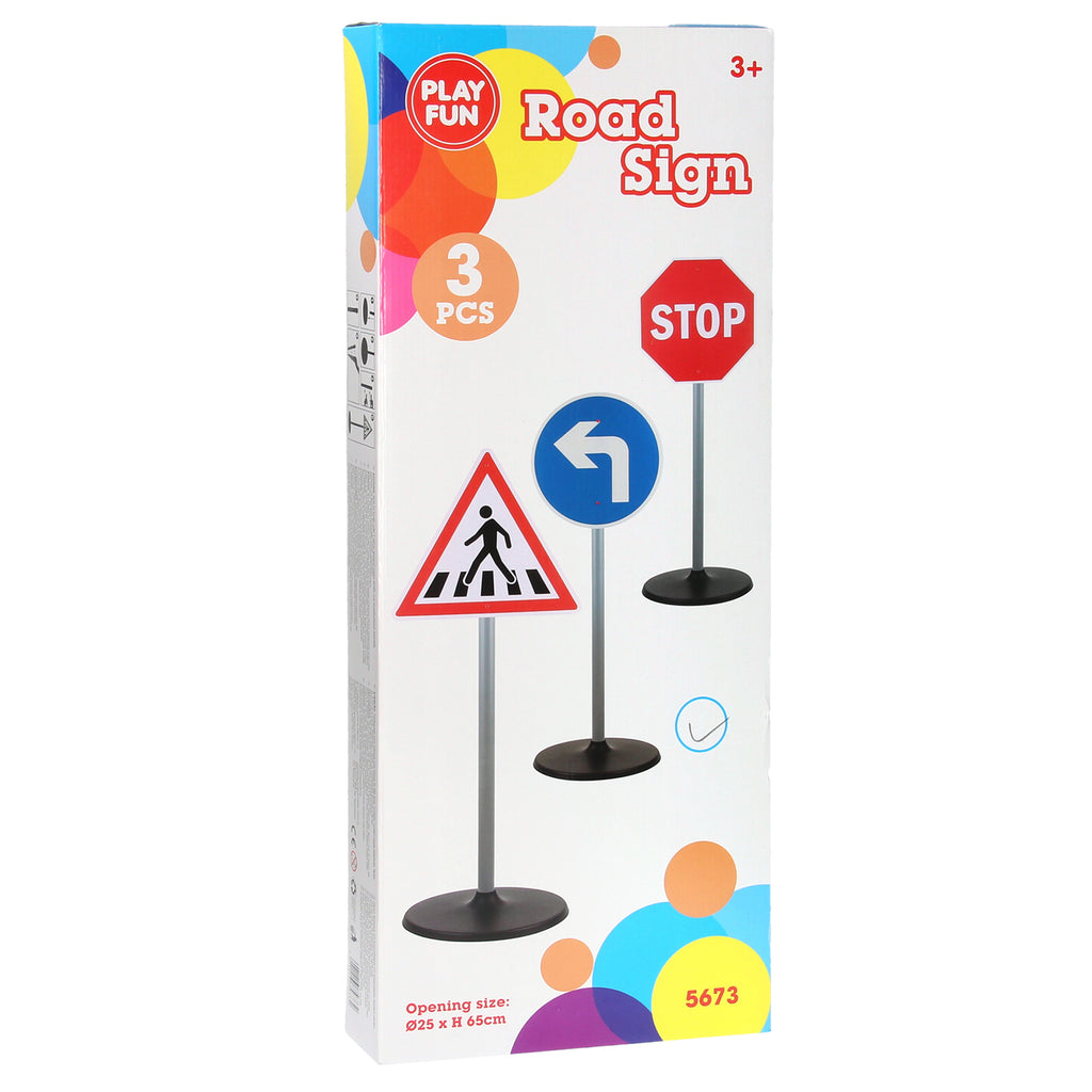 Met deze verkeersborden van 65 cm hoog kun je in je eigen tuin het verkeer regelen. De verkeersborden zijn gemaakt van stevig kunststof en verpakt per 3 stuks. De doos bevat 3 verkeersborden en 3 standaards. Er zijn 2 verschillende sets met verkeersborden.
