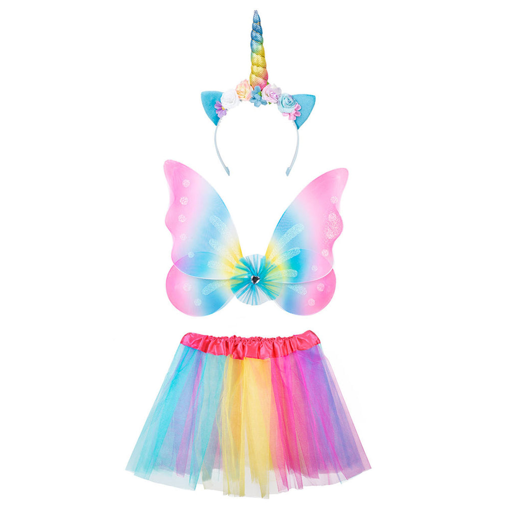 Een tule rokje in prachtige kleuren met bijpassende vleugels en een prachtige haarband. Wat wil je nog meer? Deze verkleedset tovert je om tot een prachtige, magsiche eenhoorn fee. Materiaal: 100% Polyester. Vleugels 33x38 cm.