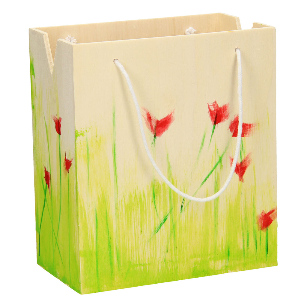 Deze houten tas is weer eens iets anders dan een tas van stof of van papier. Je kunt de houten tas versieren naar eigen smaak en na afloop er leuke cadeautjes in stoppen of iets anders. Het tasje heeft 2 handige hengsels. Hoogte: 18 cm.
