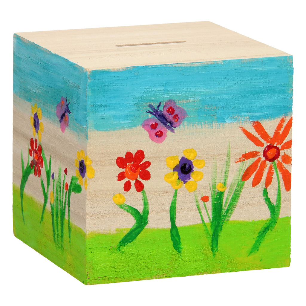 Verf of versier deze houten spaarpot zoals jij zelf wilt! Boven op de spaarpot zit de gleuf waar het geld doorheen kan. Erg leuk als decoratie op een kinderkamer.