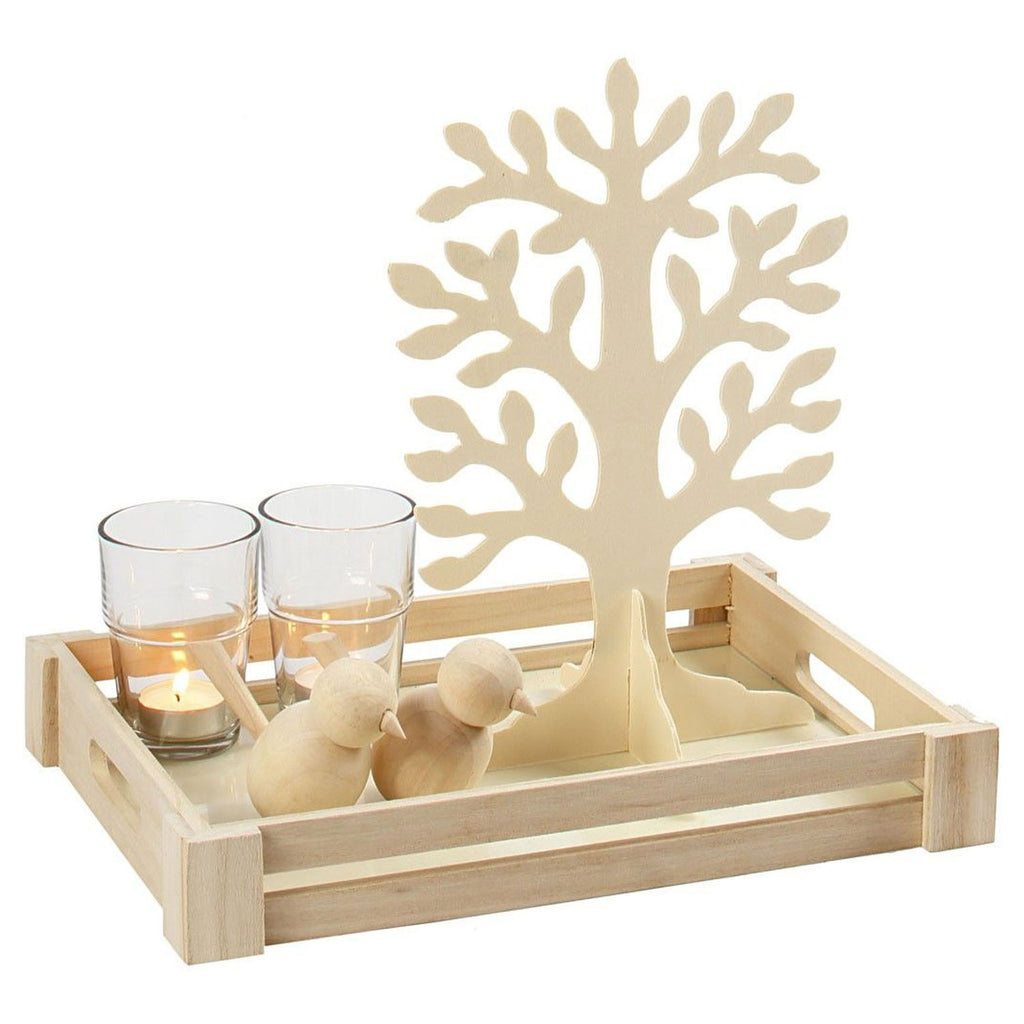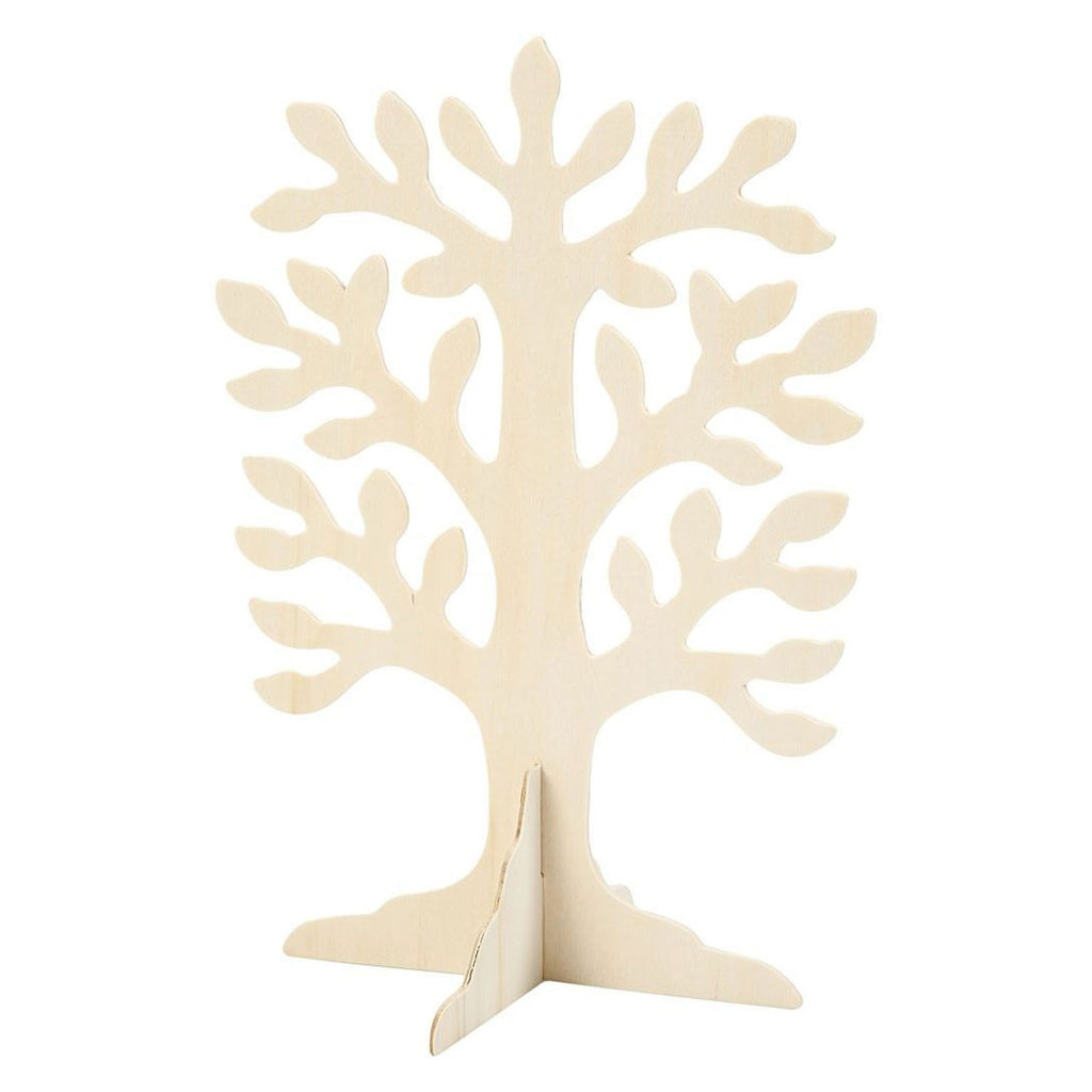 Houten boom op een voet, geschikt om zelf te versieren. De boom heeft een afmeting van 30 x 21,5 cm is 2 mm dik.