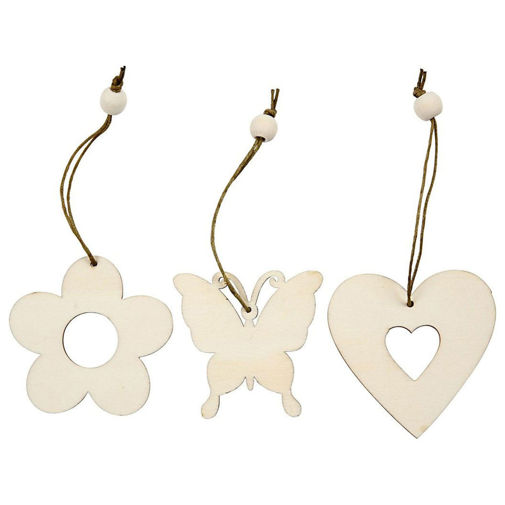 Pak bevat 3 verschillende designs, hart, vlinder en bloem. De hangers hebben een afmeting van 6 cm en zijn 3 mm dik.