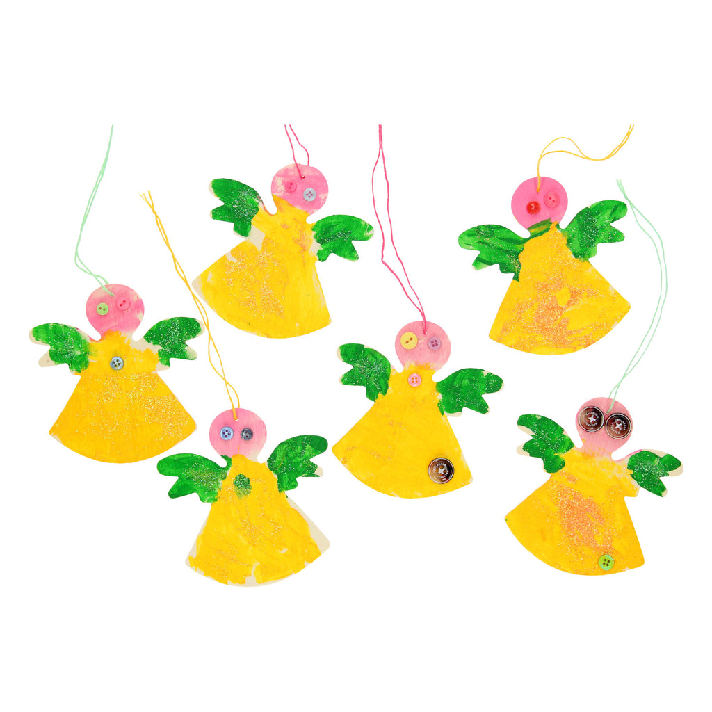 Set van 6 houten kerst engelen met oogje om de engel op te kunnen hangen. Geschikt om te versieren met bijvoorbeeld verf, glitterlijm of stiften.