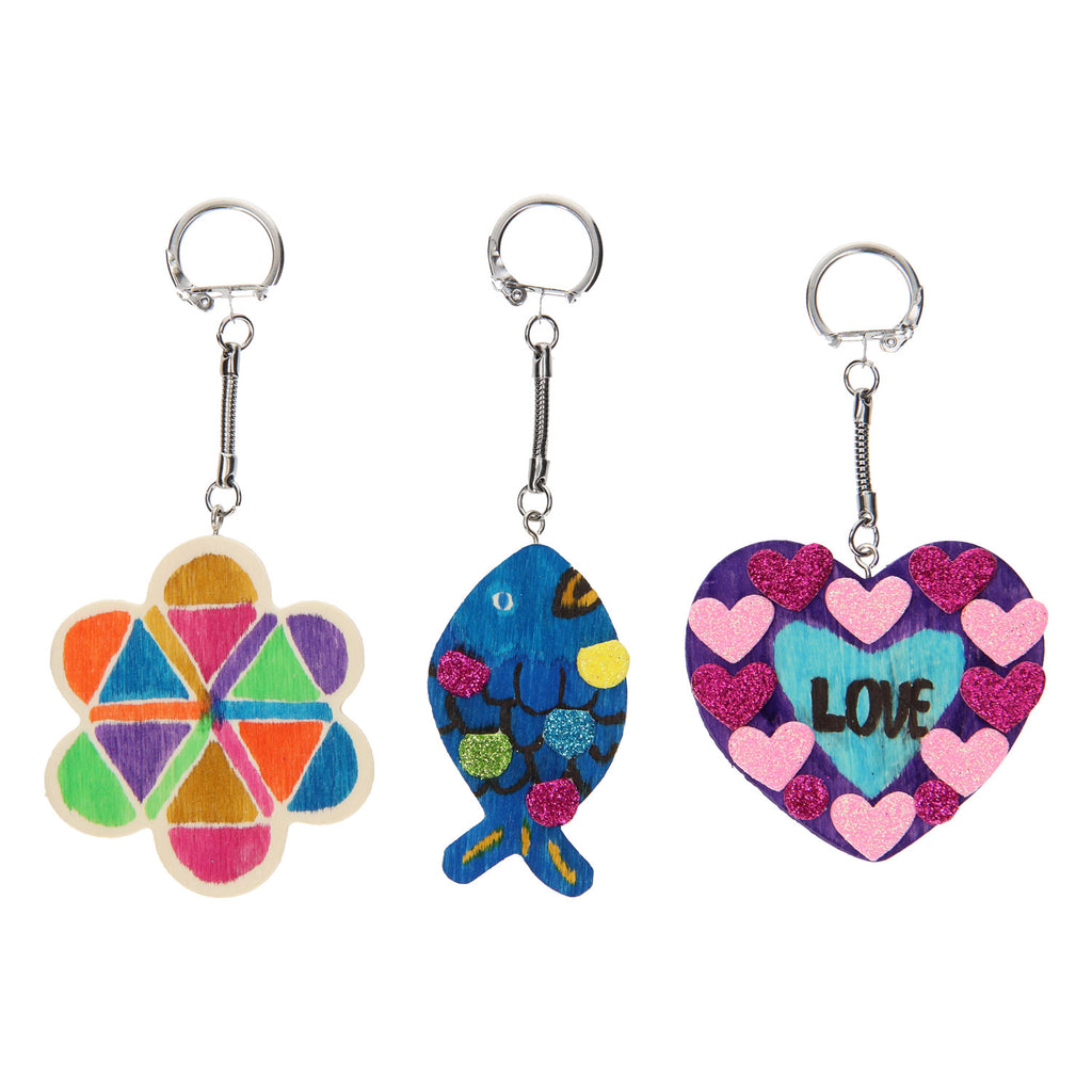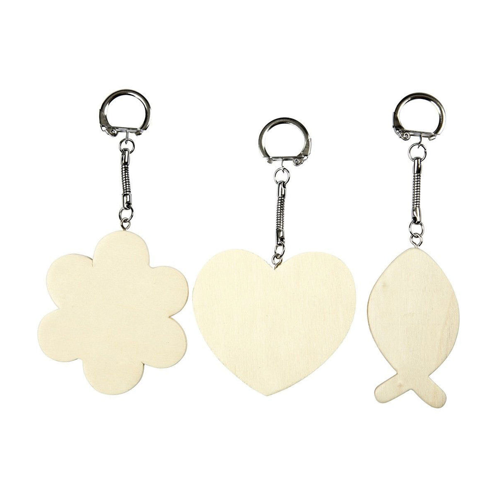 Metalen ring met hanger van hout fineer. Set van vis, bloem en hart. Heel geschikt om te versieren met bijvoorbeeld stiften, verf of glitterlijm. De hangers zijn 6-7 cm lang en en hebben een dikte van 3 mm.