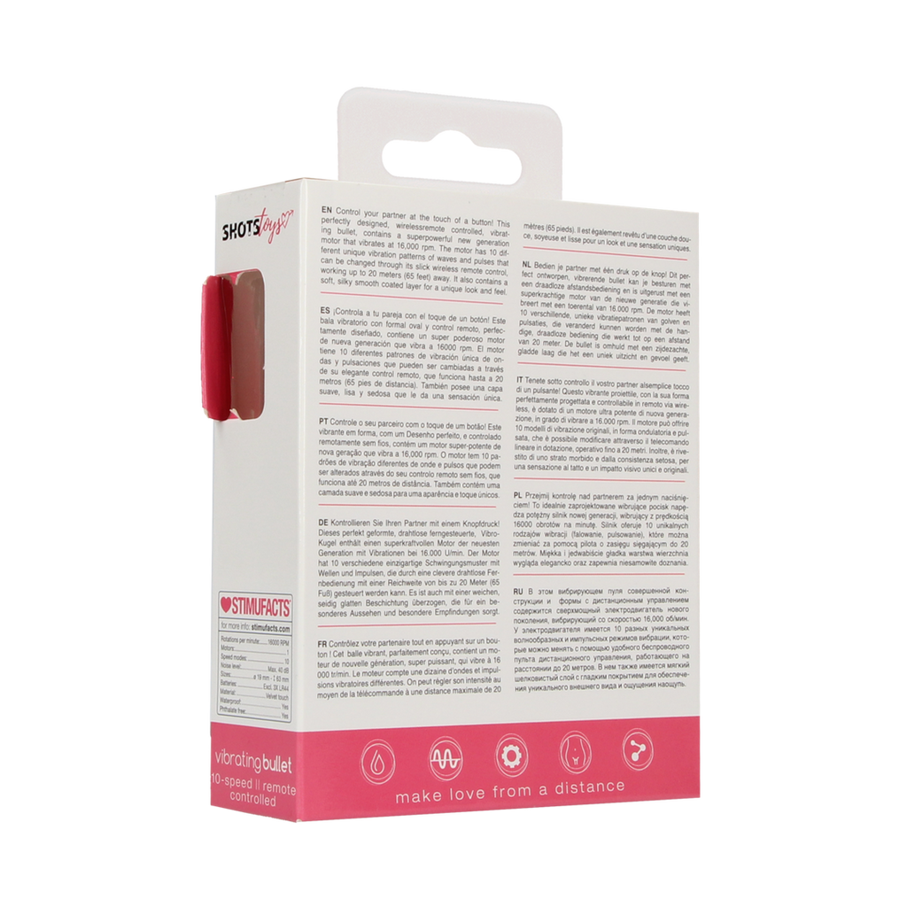 Bedien je partner met één druk op de knop! Dit perfect ontworpen, vibrerende bullet kan je besturen met een draadloze afstandsbediening en is uitgerust met een superkrachtige motor van de nieuwe generatie die vibreert met een toerental van 16.000 rpm. De motor heeft 10 verschillende, unieke vibratiepatronen van golven en pulsaties, die veranderd kunnen worden met de handige, draadloze bediening die werkt tot op een afstand van 20 meter. De bullet is omhuld met een zijdezachte, gladde laag die het een uniek uitzicht en gevoel geeft.