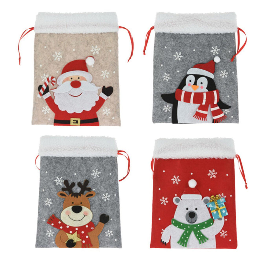Vilten kerstzakje met een kerstman, rendier, pinguïn of ijsbeer erop. Met handig trekkoord voor het openen en sluiten. Afmetingen: 26 x 21 centimeter.