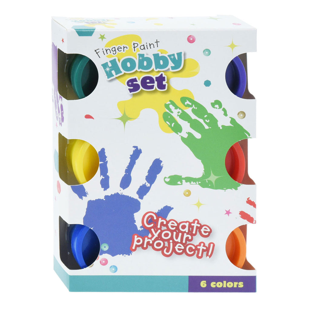 Vingerverfset met 6 potjes verf, elk met een inhoud van 30ml. Kleuren: blauw, rood, oranje, groen, geel en paars.