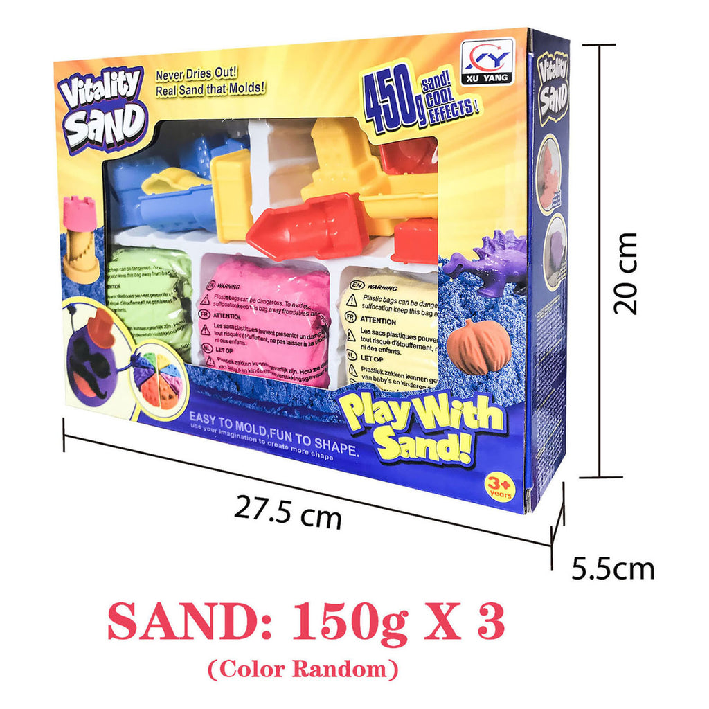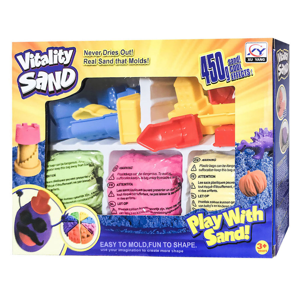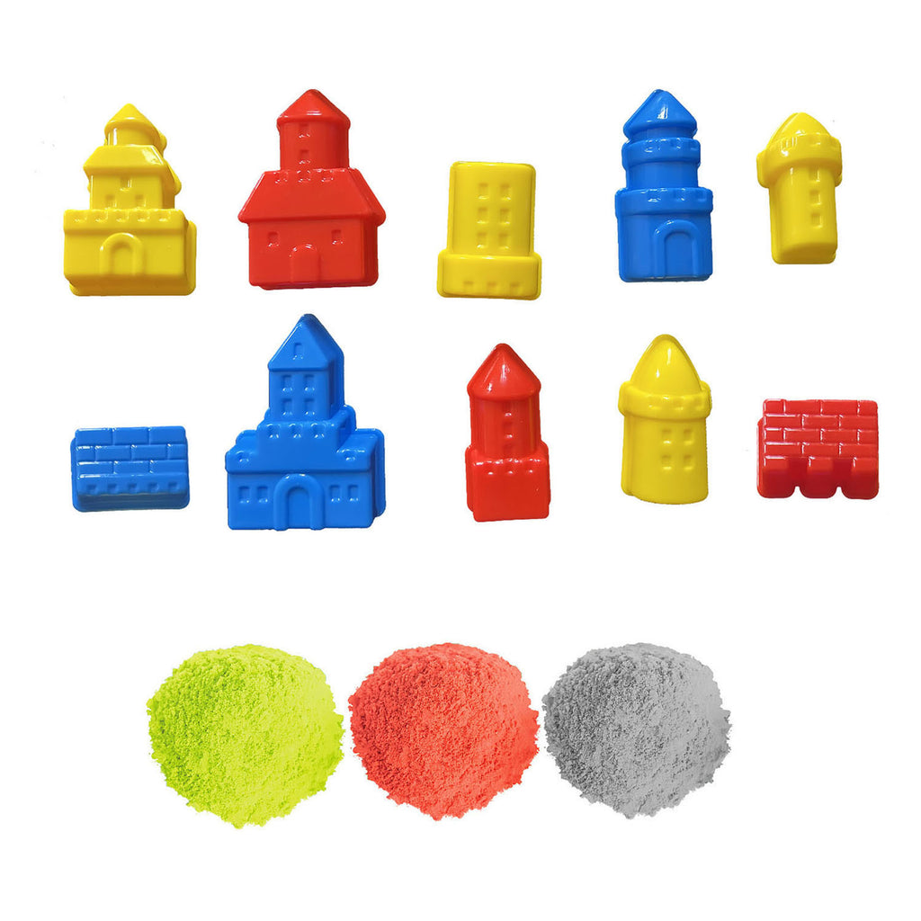 Set met 450 gram gekleurd binnenspeelzand (3x 150 gram, willekeurige kleuren) en 10 zandvormen. Afmetingen doos: 20 x 27,5 centimeter. Geschikt voor kinderen vanaf 3 jaar oud.