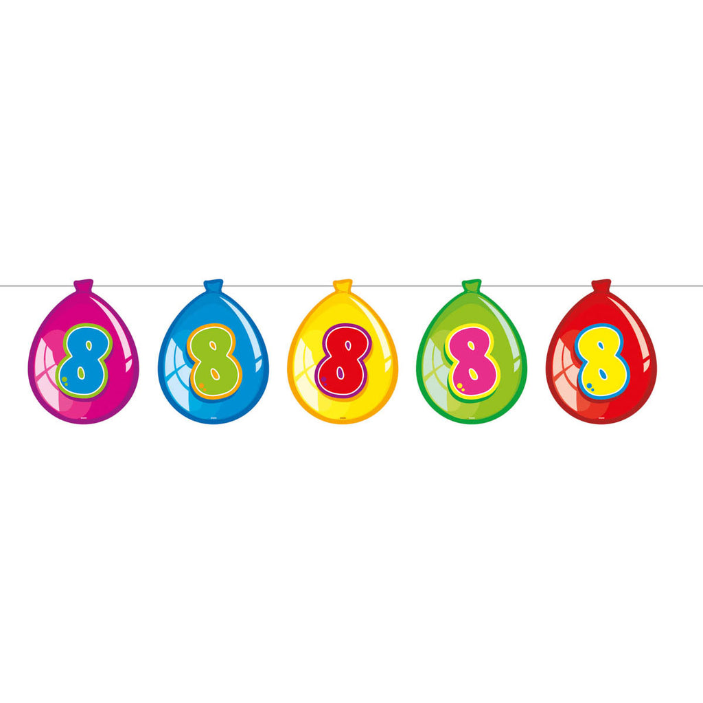 Maak de versiering voor je achtste verjaardag compleet met deze vlaggenlijn met ballonnen. De vlaggenlijn is 10 meter lang en heeft 15 kartonnen wimpels met een tweezijdige bedrukking.