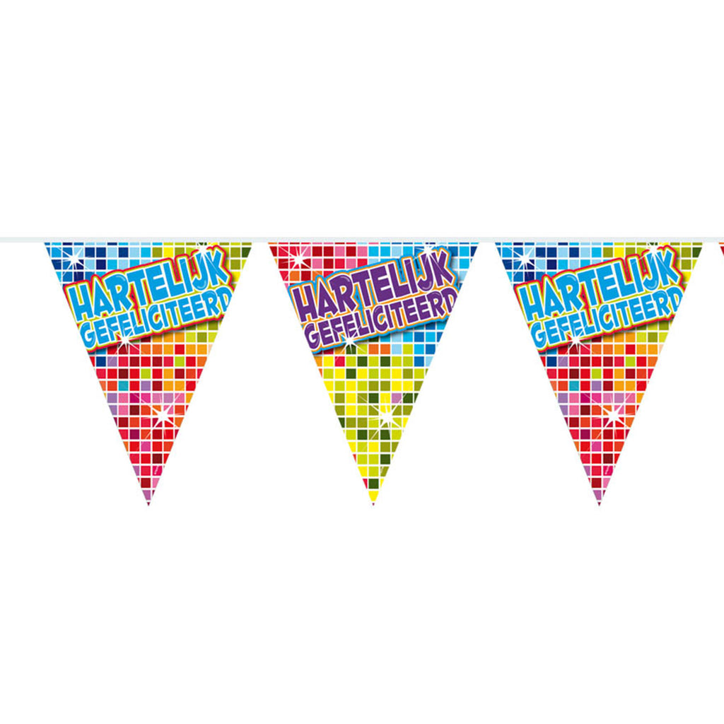 Wens de jarige een fijne verjaardag toe met deze 'Hartelijk Gefeliciteerd' slinger. Deze slinger staat perfect op ieder feestje! De slinger is enkelzijdig bedrukt, heeft 15 vlaggetjes en is 6 meter lang.