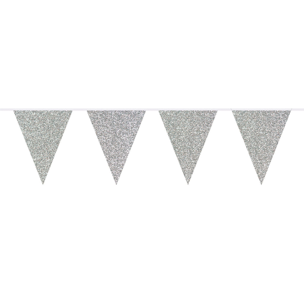 Glitters op een feestje doen het altijd goed! Deze zilverkleurige glitter vlaggenlijn is 6 meter lang en voorzien van 10 vlaggetjes van ieder 22 cm. De vlaggetjes zijn aan beide kanten bedrukt. Je kunt de vlaggenlijn gebruiken op huwelijksfeesten, Hollywood themafeesten of luxe party's.