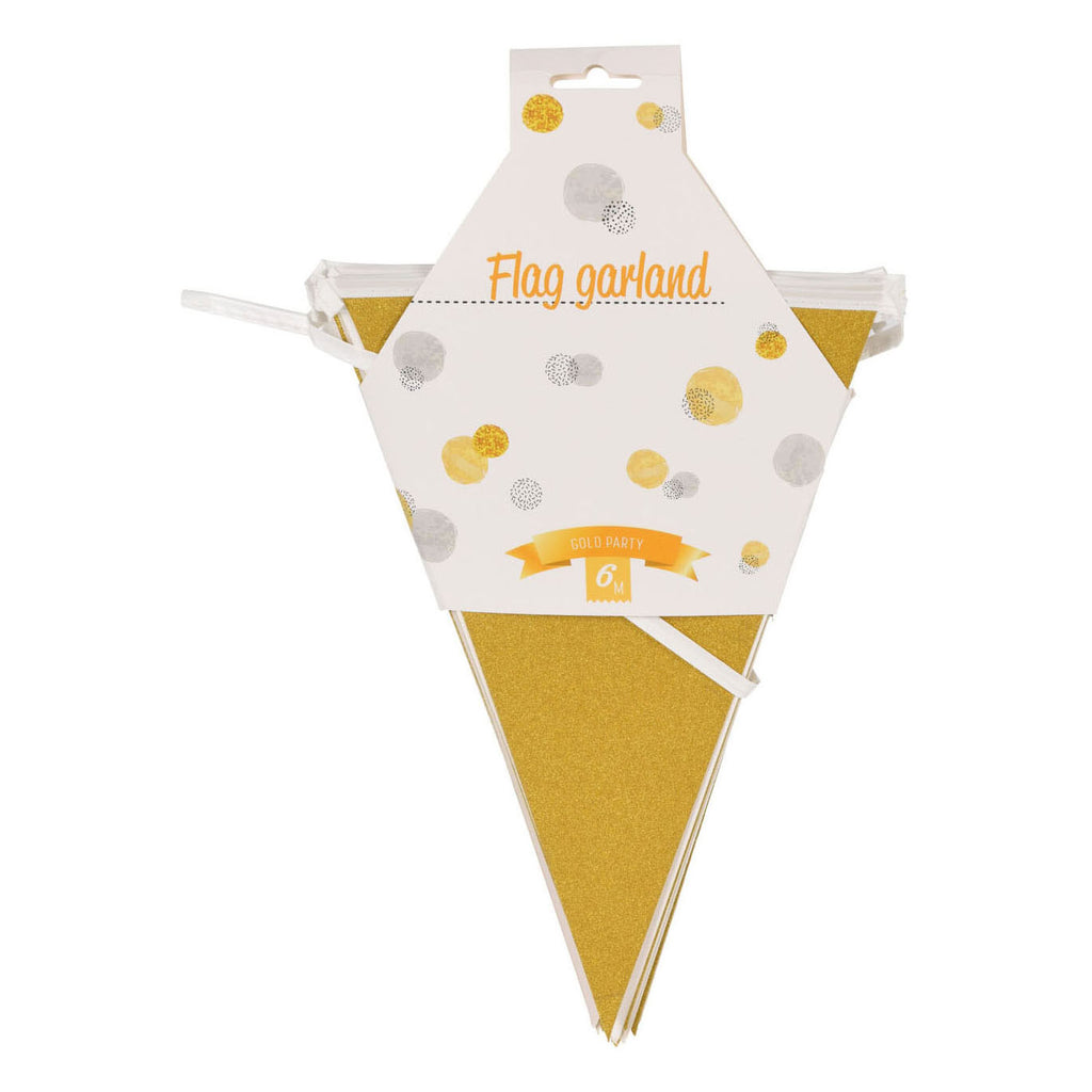 Vlaggenlijn van 6 meter lang, inclusief aanknoopsnoer. De vlaggenlijn bevat 25 gouden vlaggetjes die glinsteren.