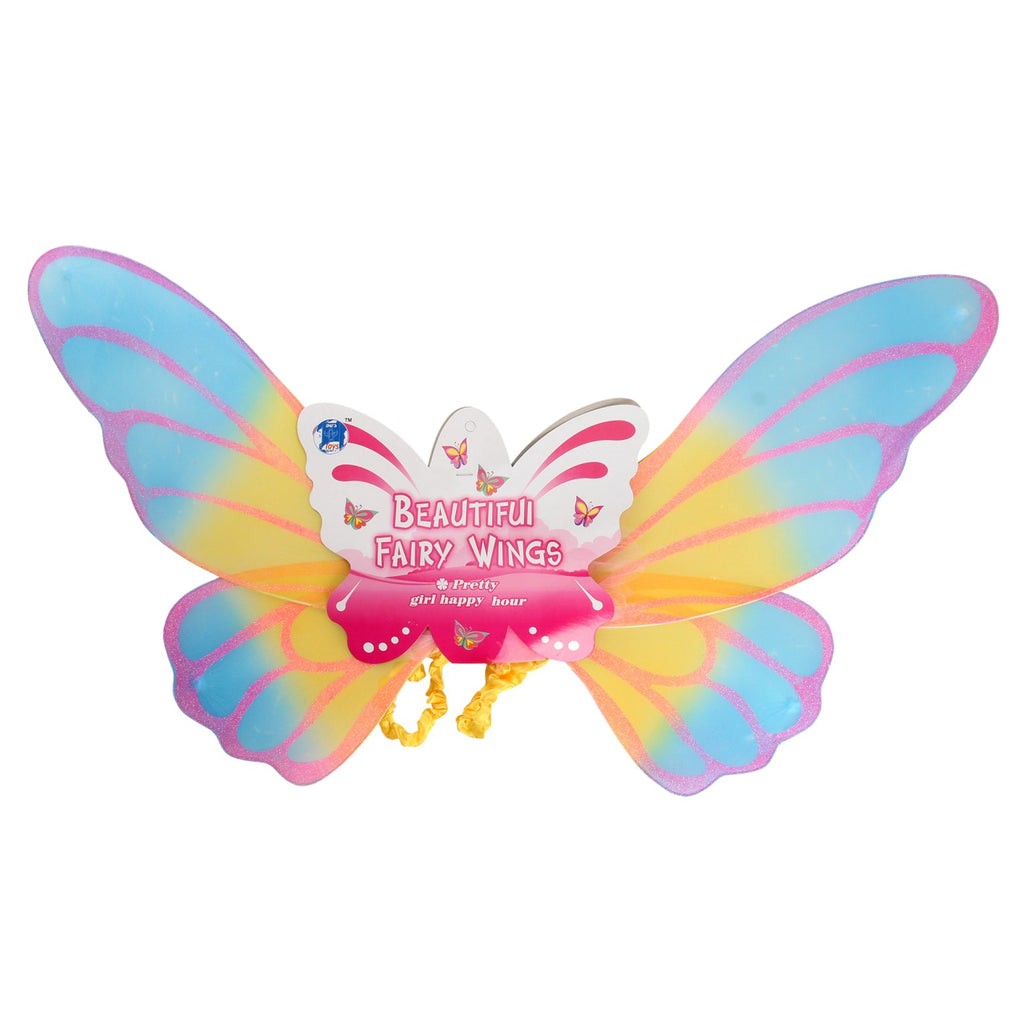 Straal als een vlinder met deze kleurrijke Vlinder Vleugels. De vleugels kunnen gemakkelijk worden aangetrokken door de de 2 gele elastieken. De vleugels zijn geel en blauw van kleur en zijn afgewerkt met roze glitters.