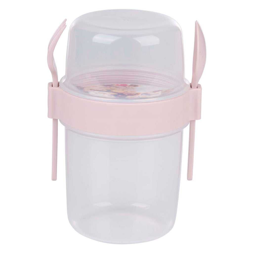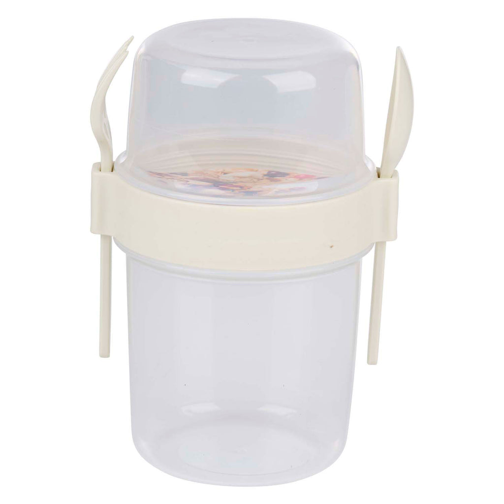 Yohurt beker met besteksetje en afneembare bakje bovenop. Afmeting: Ø 8 x 15 cm