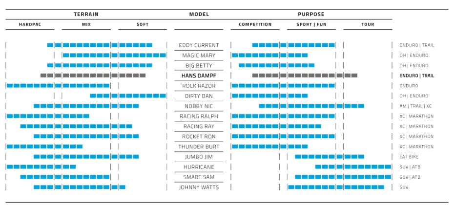 DE ALLESKUNNER VOOR ALL MOUNTAIN EN ENDURO. Alles wat het plezier bij de E-Enduro nog groter maakt heeft Hans Dampf in petto. Voor een geweldig rijgedrag en de hoogste lekbescherming op veeleisende trails, zowel uphill als downhill. Precieze positionering van de noppen voor een gecontroleerd en goedmoedig rijgedrag tot het uiterste. De combinatie van grote en kleine schoudernoppen geeft de fietser optimale grip op uiteenlopende ondergronden. Semi-open gerangschikte noppen zorgen voor een optimale zelfreiniging met een beperkte rolweerstand. Eigenschappen: Grootte: ETRTO 60-622 (29 x 2.35 Inch) Type: Vouwband Rubbermengsel: ADDIX Soft Uitvoering: Super Trail Kleur: Classic Seal: TLE Gewicht: 1075 gram Bandenspanning: 1.60 -3.50 Bar (23 - 50 psi) Max. belasting: 125 kg EPI: 50 Profiel: HS491 Binnenbanden:19, 19A, 19+AP, 19F