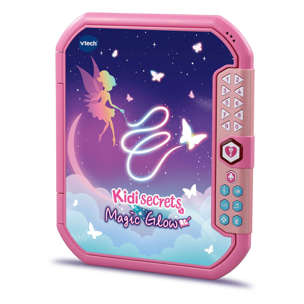 Met de Kidisecrets Magic Glow van VTech zijn al je geheimen veilig! Alleen jij kunt dit dagboek openen met een geheime toegangscode! Schrijf al je geheimen op in het notitieboek met de magische pen die onzichtbare inkt bevat. Gebruik het speciale licht om jouw geheimen te bekijken. Maak muziek, speel een geheugenspel, ontdek jouw geluksgetal en luister naar wijze woorden. Kidisecrets, meer dan alleen een dagboek!
